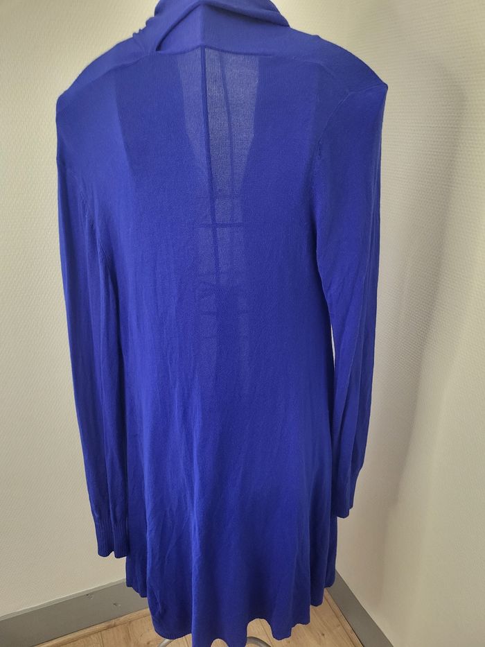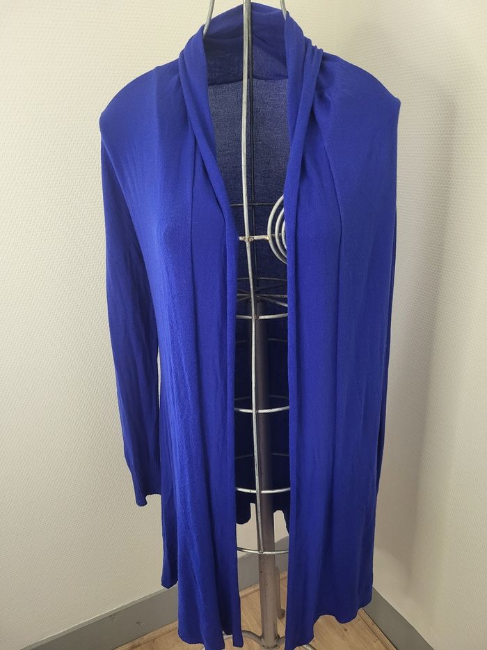 Description : Ajoutez une touche de couleur à votre garde-robe avec ce gilet bleu vibrant, à la fois doux et confortable. Une pièce idéale pour égayer les journées fraîches. ​Coupe : Coupe ouverte et décontractée, sans boutons. ​Détails : * Jolie maille tricotée avec des motifs ajourés sur le devant et les manches. ​Finitions bords-côtes aux poignets. ​Marque : Sans marque (NPO). ​Taille : Taille 38 ​État : Très bon état.