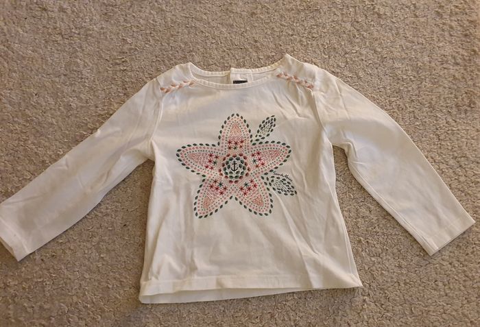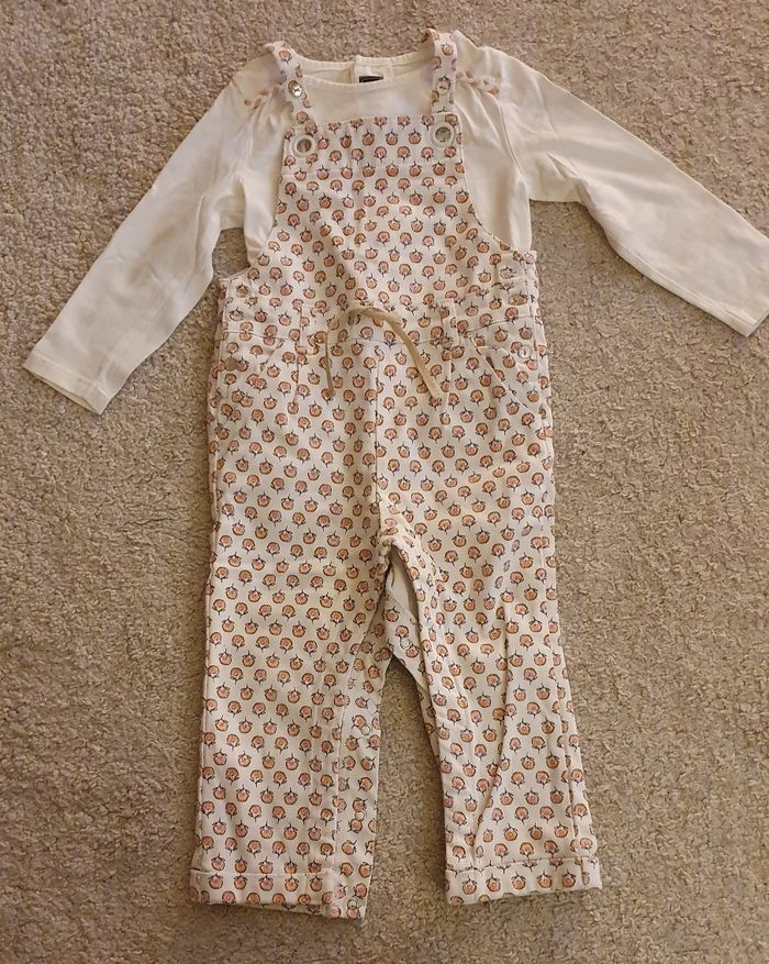 Salopette en jean en super état de la marque Tape à l'œil ouverture par pression à l'entrejambe et T-shirt manche longue blanc comme neuf de la marque Terre de Marins. Taille 24 mois