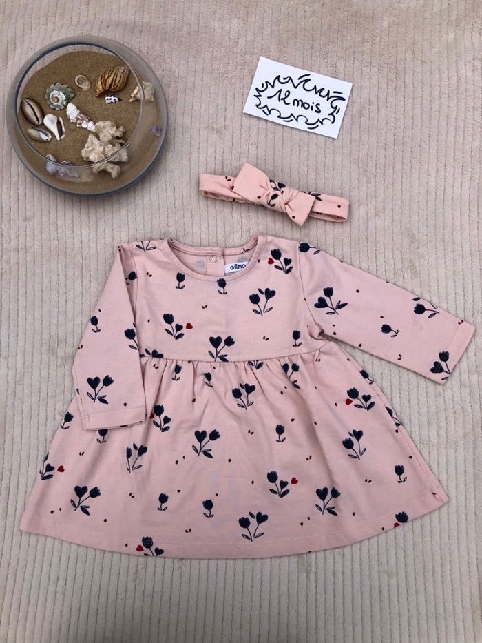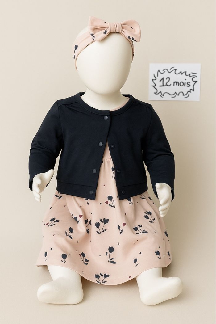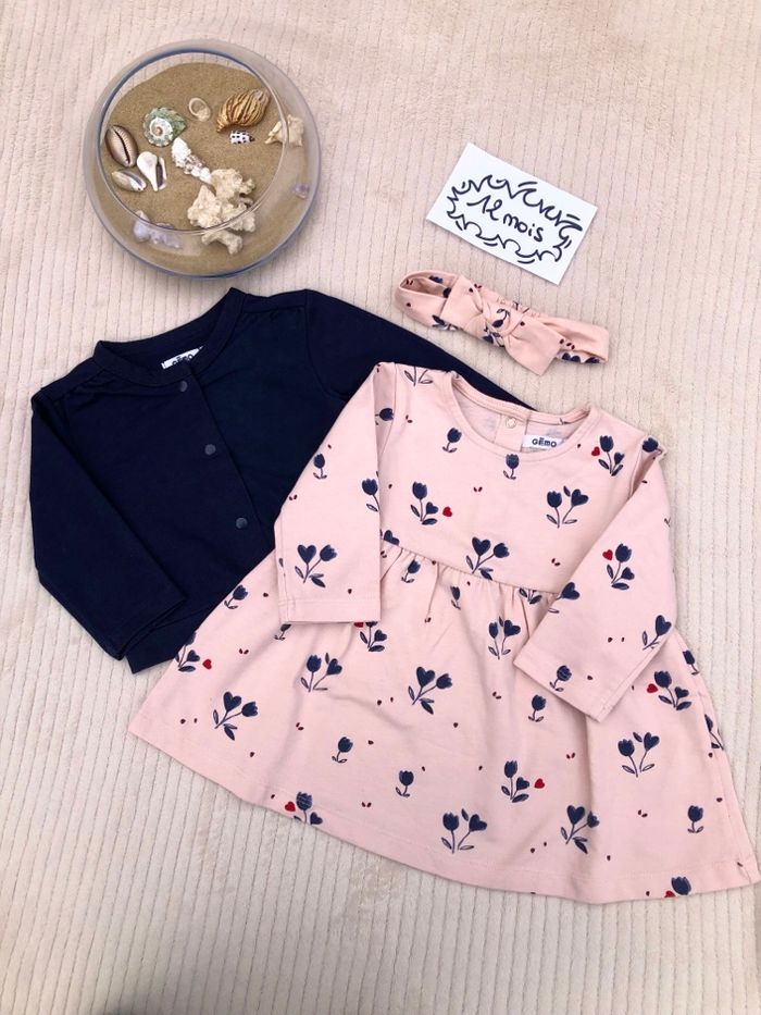 Ensemble, 12 mois, très bon état, vêtements de premières mains, Gémo : - une robe évasée, à manches longues, col rond, ouverture pressionnée en haut du dos, motif tulipe 🌷/ fleur et cœur ♥️, rose poudré et motif bleu marine et rouge - un gilet bleu marine, à manches longues, fermeture pressionnée sur le devant - un bandeau élastique du même tissu que la robe, avec noeud 🛍 Dressing trié par taille, les catégories sont accessibles à partir de mon profil ! Bon shopping ! #fille12moisnikita40000