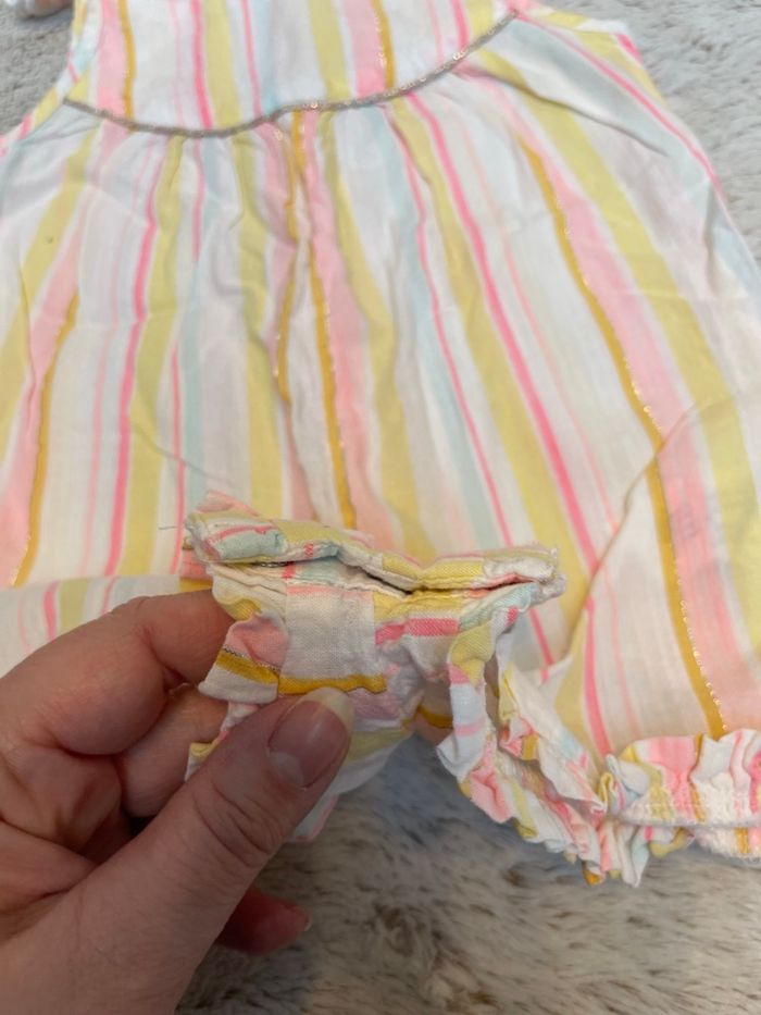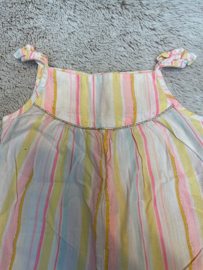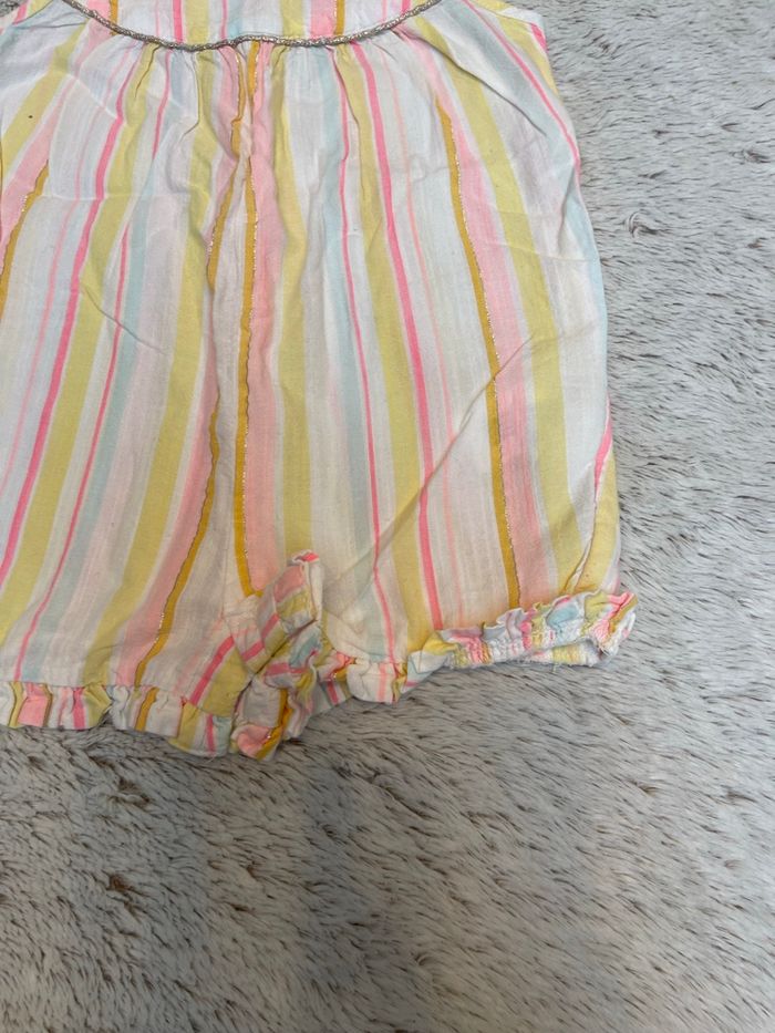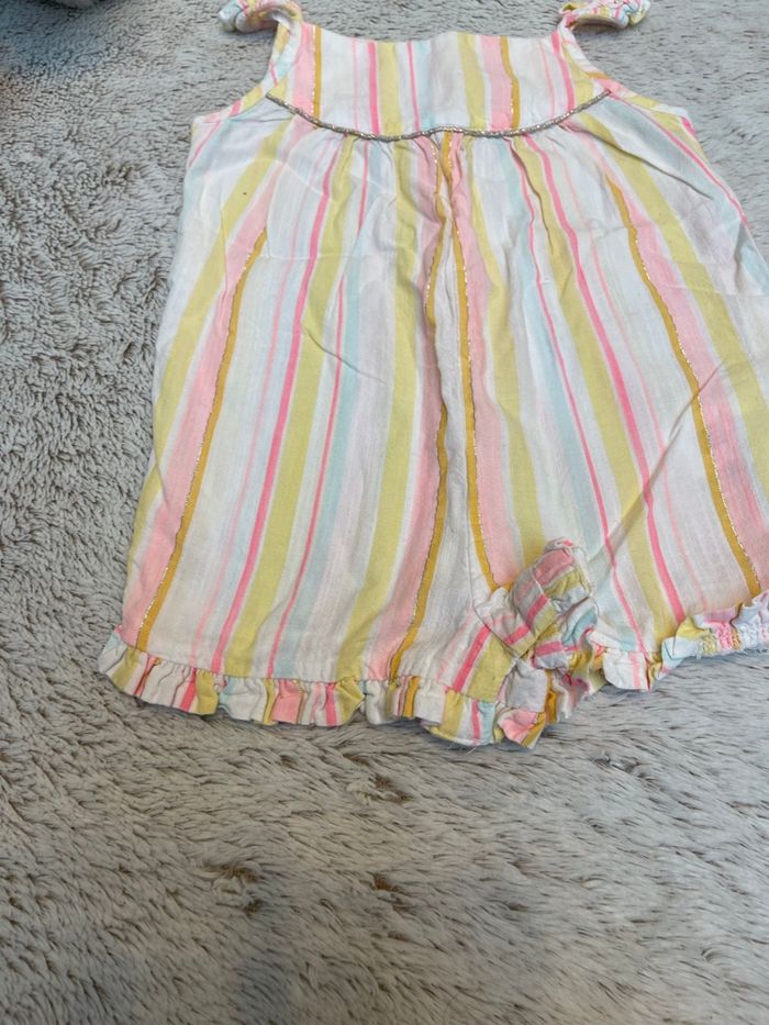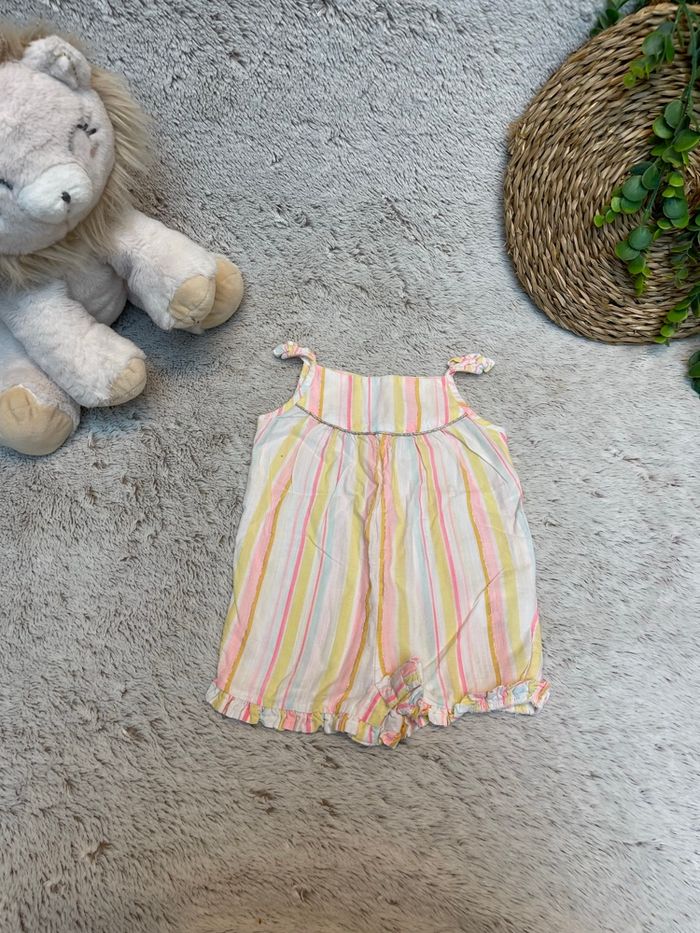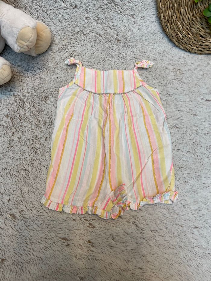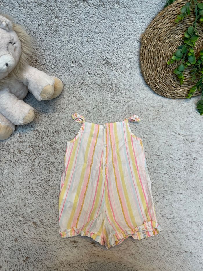 Combinaison en style lin à rayures dans les tons jaune rose et bleu ciel Taille 9 mois Tape à l’œil Très bonne état