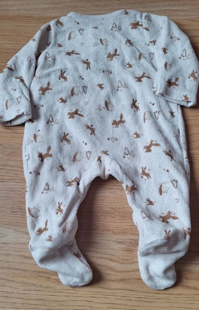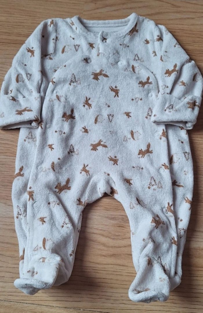 Petit pyjama avec bonnet en velour porté quelque fois taille très bien ouverture devant très pratique pour les changer les couche taille 1 mois 56cm