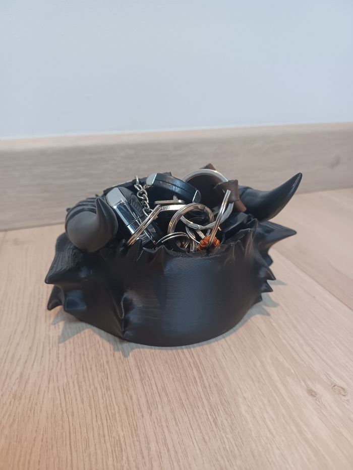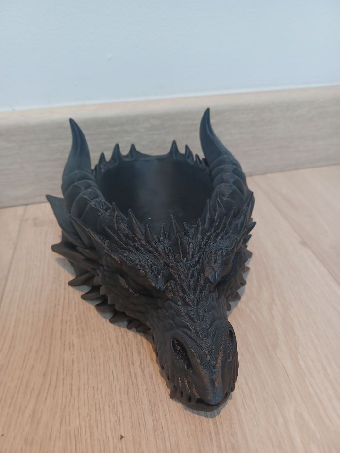 Marre de perdre vos clés ? Confiez-les à ce gardien légendaire ! Cette tête de dragon majestueuse n'est pas qu'un simple objet de décoration, c'est un vide-poches robuste et détaillé, parfait pour une entrée de maison ou un bureau. Fabrication : Impression 3D de précision (plus de 4h30 de travail machine). Conçu avec 130g de PLA Noir Finition : Noir profond avec un superbe rendu des écailles et des reliefs. Dimensions : Idéal pour accueillir un trousseau de clés complet, des badges ou de la monnaie (voir photos avec les clés Peugeot pour l'échelle). Un incontournable pour les fans de Fantasy, Game of Thrones, Donjons & Dragons ou simplement pour ceux qui veulent une déco qui sort de l'ordinaire. Envoi : Emballage soigné pour protéger les cornes et les détails lors du transport. #dragon #videpoches #impression3d #3dprint #déco #fantasy #geek #médiéval #rangement #entrée #maison #faitmain #cadeau #got #dnd #blackpla #artisanat