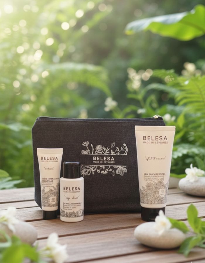 Découvrez l’essentiel de la cosmétique cévenole avec la Trousse Essentielle BELESA, un rituel complet pour une peau hydratée, douce et éclatante. Ce trio de soins naturels allie efficacité, sensorialité et respect de l’environnement. Le contenu du coffret : Crème Visage Essentielle (25ml) : Hydrate intensément, apaise et prévient les premiers signes de l’âge. Fini soyeux et non comédogène. Eau Micellaire Essentielle (50ml) : Nettoie et démaquille en douceur le visage et les yeux pour une sensation de fraîcheur immédiate. Soin Douche Essentiel (100ml) : Un nettoyant ultra-doux sans sulfate pour le visage, le corps et les cheveux. Idéal pour toute la famille. Pourquoi l'adopter ? Format voyage : Pratique et nomade, parfait pour vos déplacements. Naturel & Local : Formules enrichies en actifs des Cévennes, douces pour la barrière cutanée. Éco-responsable : Présenté dans une trousse en coton bio (GOTS) réutilisable.