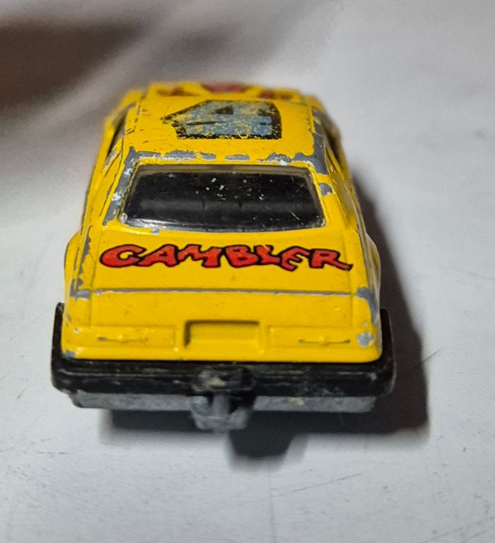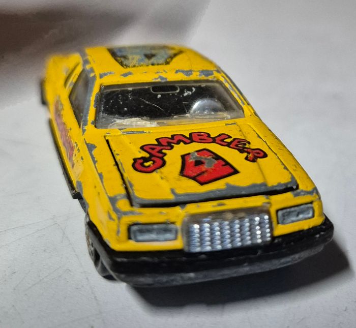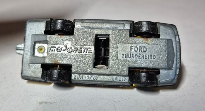 Modèle réduit Majorette Ford Thunderbird, échelle 1/67, référence n°217. Carrosserie jaune décorée “Gambler” avec numéro 94, motifs rouges et noirs et attelage arrière. Vitrages transparents, intérieur blanc et roues noires à jantes argentées. Châssis métal estampillé Majorette Ford Thunderbird Made in France. Modèle présentant une usure marquée : peinture écaillée, stickers effacés et traces d’usage. Etat conforme aux photos #majorette #fordthunderbird #majorettevintage #madeinfrance #voitureminiature #diecast #modelereduit #collectionminiature #miniature167 #majorette217