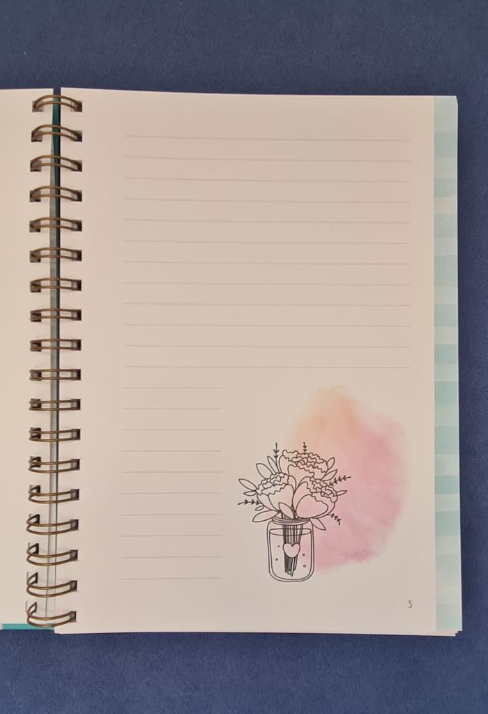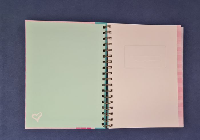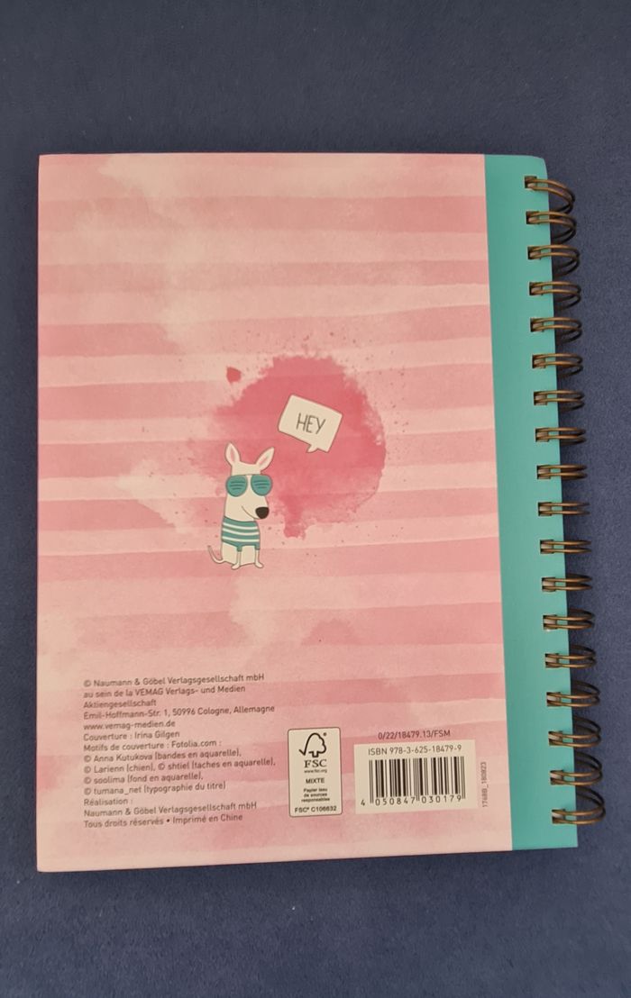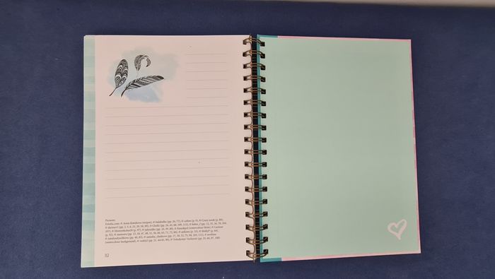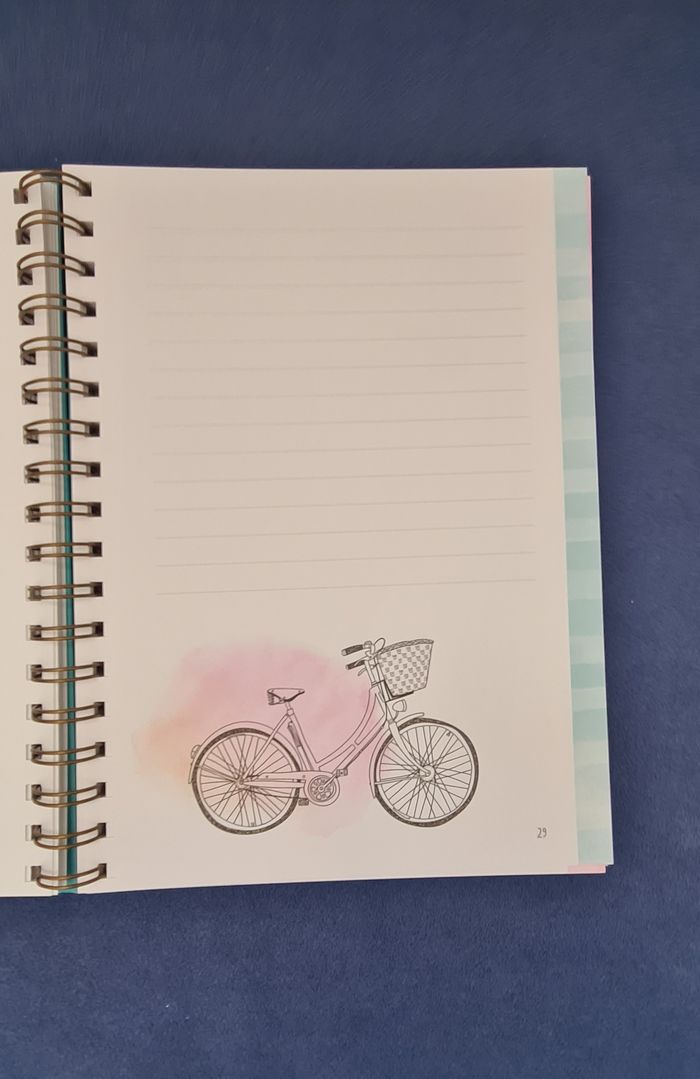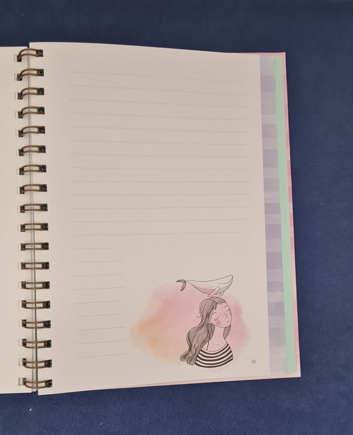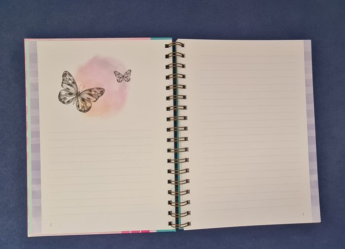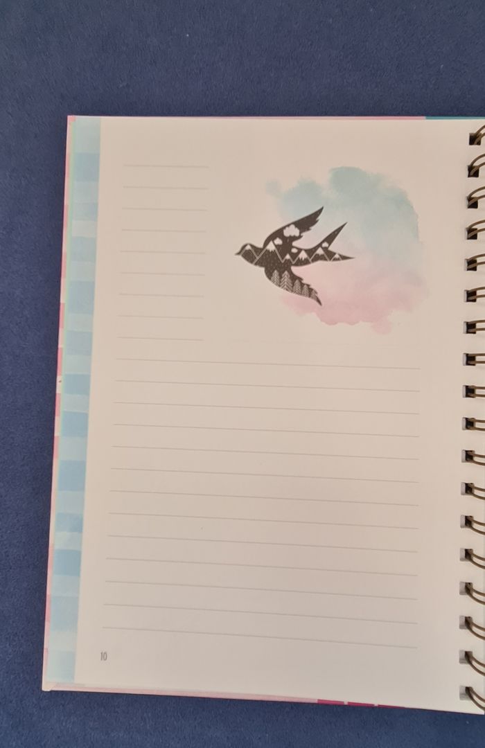 Carnet avec grosse spirale et couverture épaisse et rigide, permettant écriture ou prise de note dans n'importe quelle situation. Les pages sont numérotées jusqu'à 112, bordées d'une bande à rayures irrégulières dans des tons doux (violet, rose, jaune, vert, bleu). Chaque double page est décorée d'un motif délicat (papillon, plumes, fleurs, montgolfière,...). Belle qualité de papier Totalement neuf #journal #carnet #cahierpastel #joliepapetterie #mar-taybureau