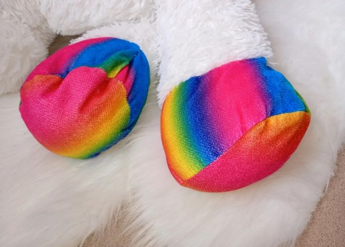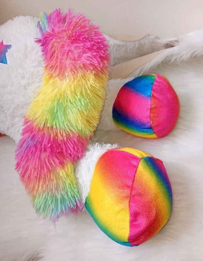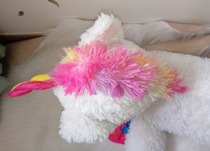 Grande peluche licorne mesure plus ou moins 51 cm de long. Posée sur le lit mais reste en bon état. Elle vient d'être lavée.