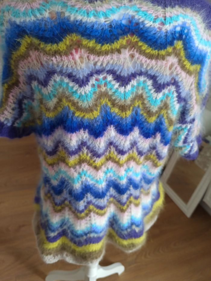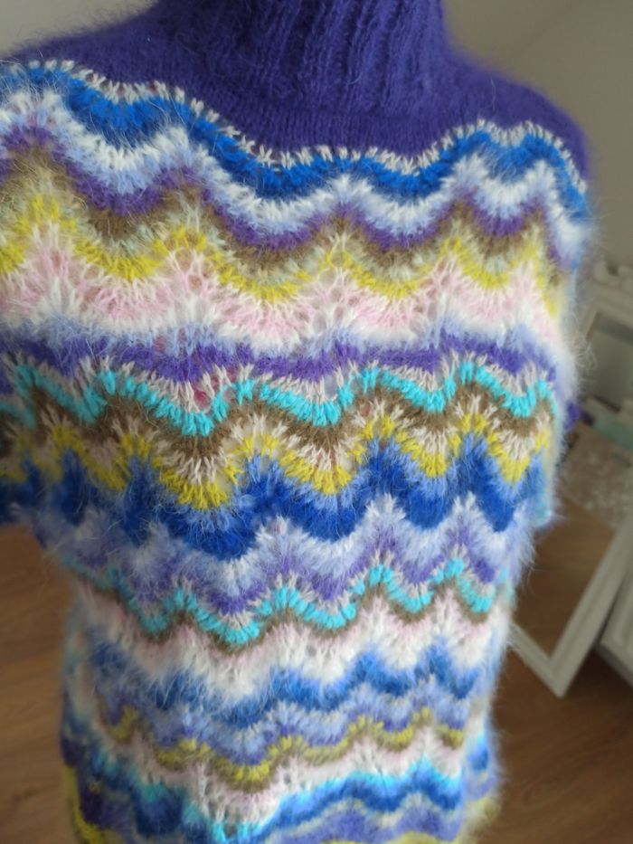 Neuf pull angora tricoté main jamais porté Modèle unique réalisé dans un fil angora 80% de qualité Anny Blatt extrêmement doux et duveteux Un vrai bonheur a porter Points de vagues rayé dans les tons de violets, bleus,rose pâle,blanc,vert kaki,anis Ses dimensions largeur 55 cm et longueur 55 cm ,lui permettent d'être porté par les tailles 34 à 40/42