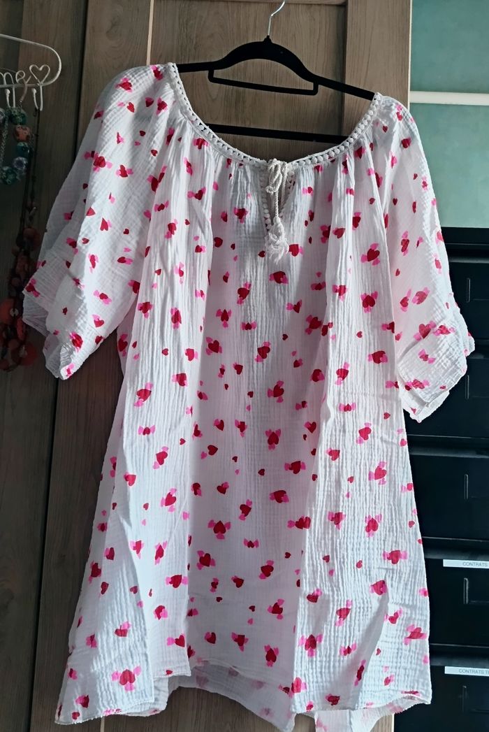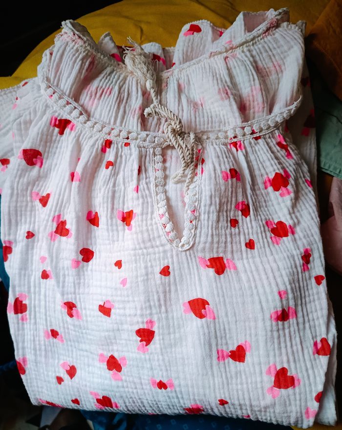 Je vends cette jolie tunique légère et fluide, parfaite pour le printemps ou l'été ! Style : Esprit bohème / romantique. Couleur : Blanche avec un motif de petits cœurs dans des tons dégradés de rose et rouge. Matière : Aspect coton texturé (type gaze de coton), très agréable à porter et respirant. Détails : * Joli décolleté arrondi avec une finition en dentelle fine. Lien à nouer avec pompons à l'avant. Manches courtes évasées. État : Très bon état, peu portée. C'est une pièce très confortable qui se marie parfaitement avec un jean ou un short en jean Prix ferme