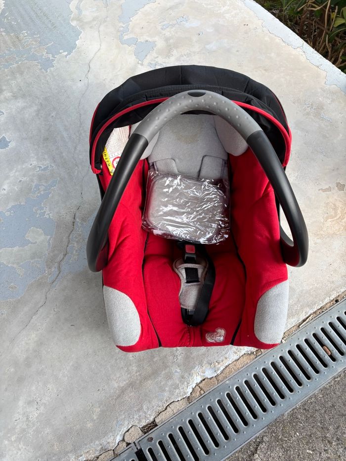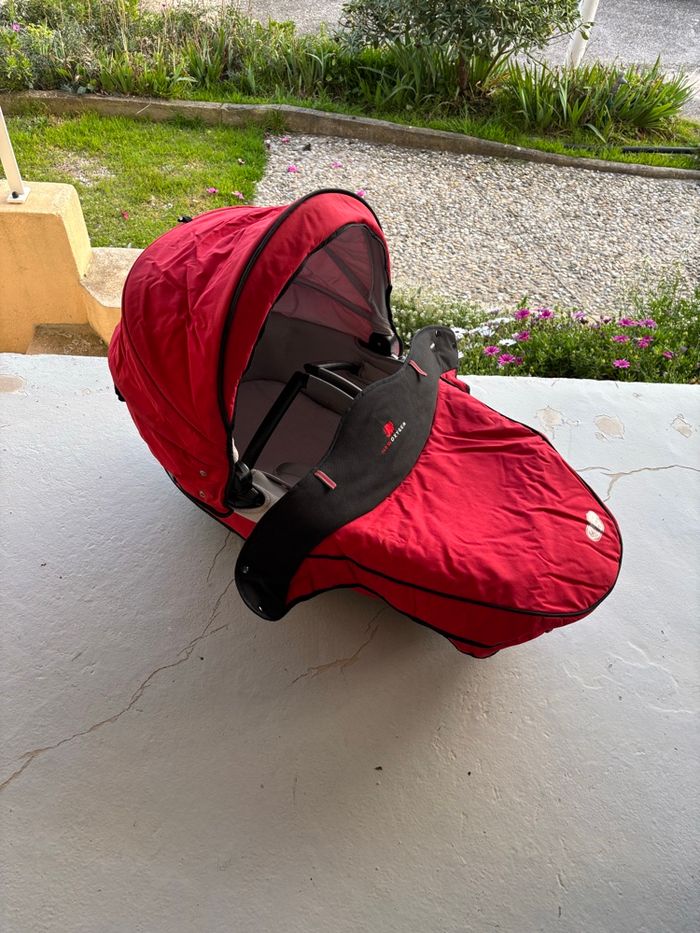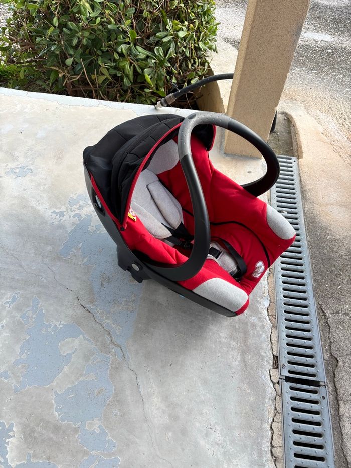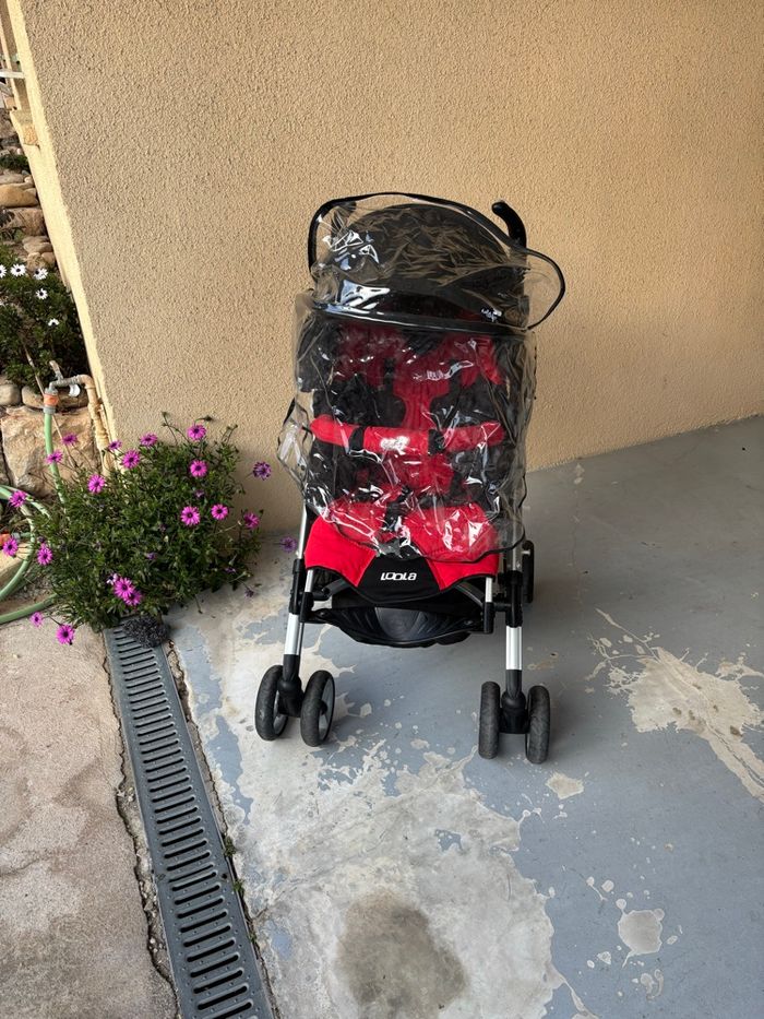 Vends poussette Bébéconfort 3 en 1 : nacelle cosy et poussette clipsables sur châssis. Modèle Loola. Couleur : rouge et noir. Année 2005. Avec accessoires : ombrelle avec sa fixation et 2 protections pluie pour la poussette et le cosy. Et un rabat pour la nacelle. Frein fonctionnel. Poussette pliée tenant à la verticale. Pas d’expédition . À retirer sur place. À Carnoux.
