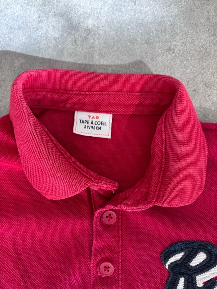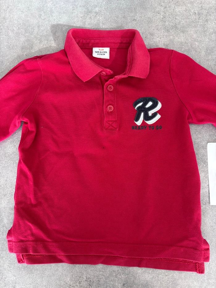 Lot de 3 hauts 36 mois / 3 ans ; - 1 polo manche longues rouge tape à l’œil : une tache sur le devant - 1 t-shirt tape à l’œil : une tache sur le devant - 1 haut manches longues tape à l’œil : taches sur manche et 1 sur le devant N’hésitez pas à demander + de photos