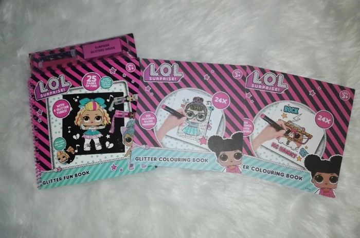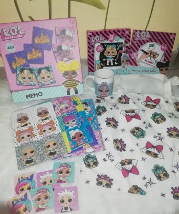 Lot effigie poupées LOL. comprend un jeu mémo comme neuf, un mug (8 cm de haut) un sac en tissu. 3 livres à colorier dont 1 avec des paillettes. Très bon état. ⚠️ PRIX FIXE NON NÉGOCIABLE
