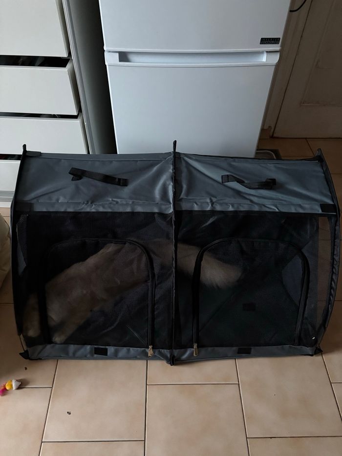 Cage de transport pliable pour voiture pouvant contenir jusqu’à 4 chat . Vendu avec son sac . Largeur 100cm, profondeur 50cm et hauteur 50cm. Ouverture devant et côté. Idéal pour ne plus avoir de poils sur les sièges de voiture