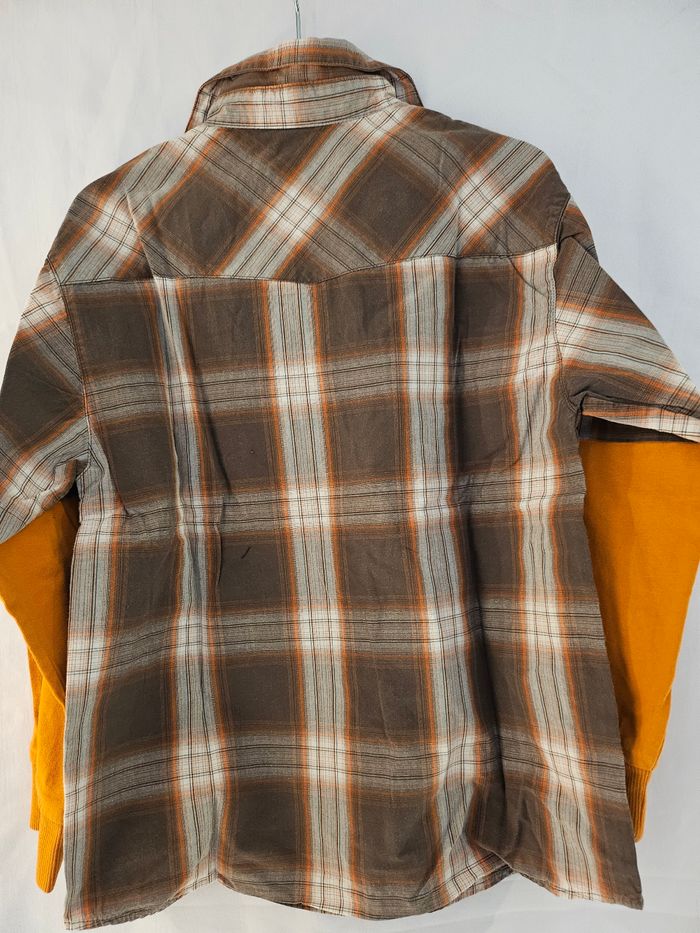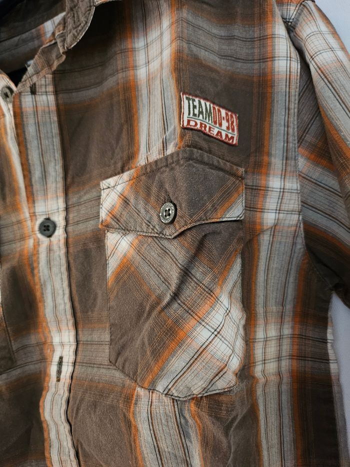 Chemise effet 2 en 1. Marron et orange. Se ferme par boutons. Poches sur la poitrine. Marque : Kiabi Taille: 8 ans