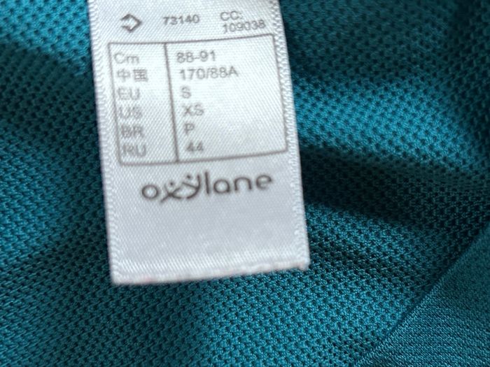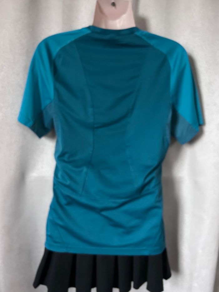 T-shirt de sport camaïeu de bleu pétrole - vert eider ( 3 teintes différentes pour 3 matières différentes, voir photo sous le bras) Taille S Oxylane Quechua Decathlon equarea Pas de tache ni de fil tiré Pas de carrure définie, manches raglan Aisselle à aisselle sans tirer 46 cm Longueur 65 cm