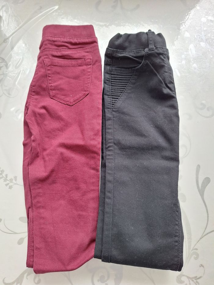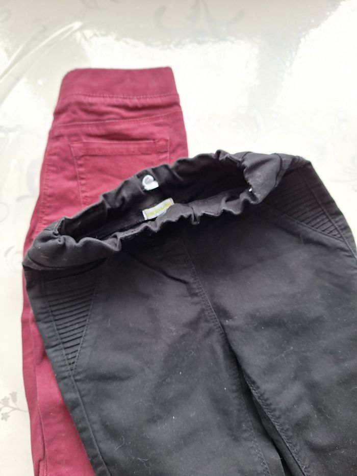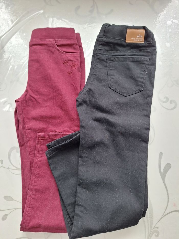 Lot de 2 jeans fille bordeaux et noir (souple élastique) A l'avant 2 fausses poches et a l'arrière 2 vrai poche Taille a enfiler en 9ans de verbaudet Le noir a juste eut un élastique de rajouter car ne tenait pas peut être enlever Casiment jamais porter