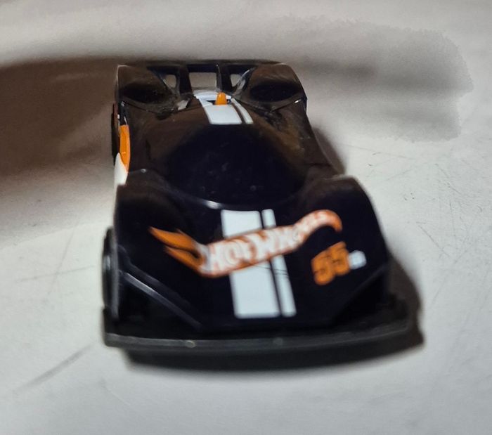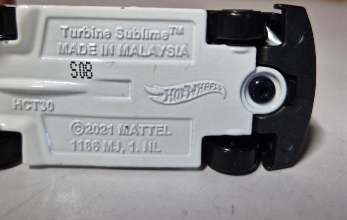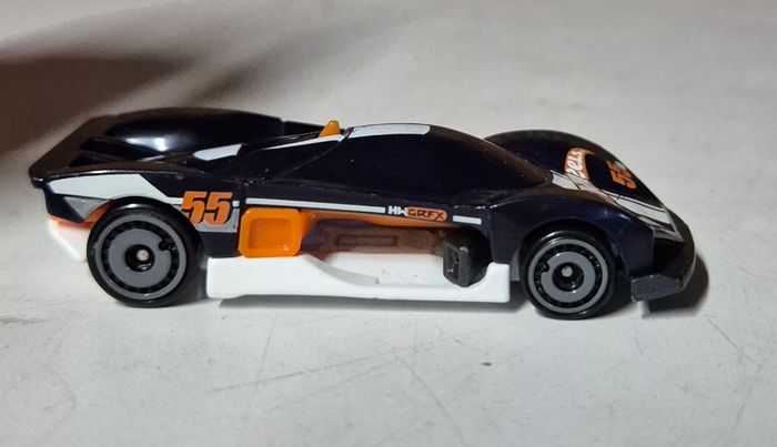 Modèle réduit Hot Wheels Turbine Sublime™, carrosserie noire avec bande centrale blanche et détails orange. Décorations n°55 et marquages HW GRFX. Design futuriste avec prise d’air centrale, diffuseur arrière blanc et roues noires à jantes turbine. Châssis blanc estampillé Turbine Sublime™, référence HCT30, fabrication Malaisie, ©2021 Mattel. Modèle en bon état avec légères traces d’usage Etat conforme aux photos #hotwheels #turbinesublime #hwgrfx #voitureminiature #diecast #hotwheelscollector #modelereduit #futuristiccar