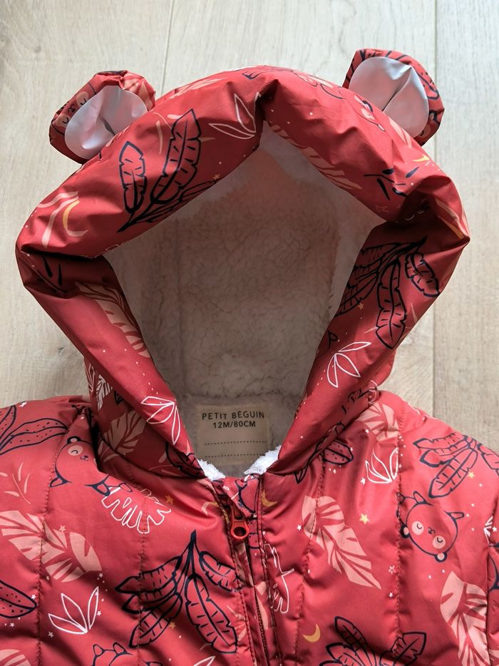 Combipilote achetée en boutique de la marque cet automne. Matière déperlante et imperméable, ouverture zippée. Moufles et chaussons retroussables. Des petites oreilles trop mimis sur la capuche. Mixte, taille 12 mois, parfait état.