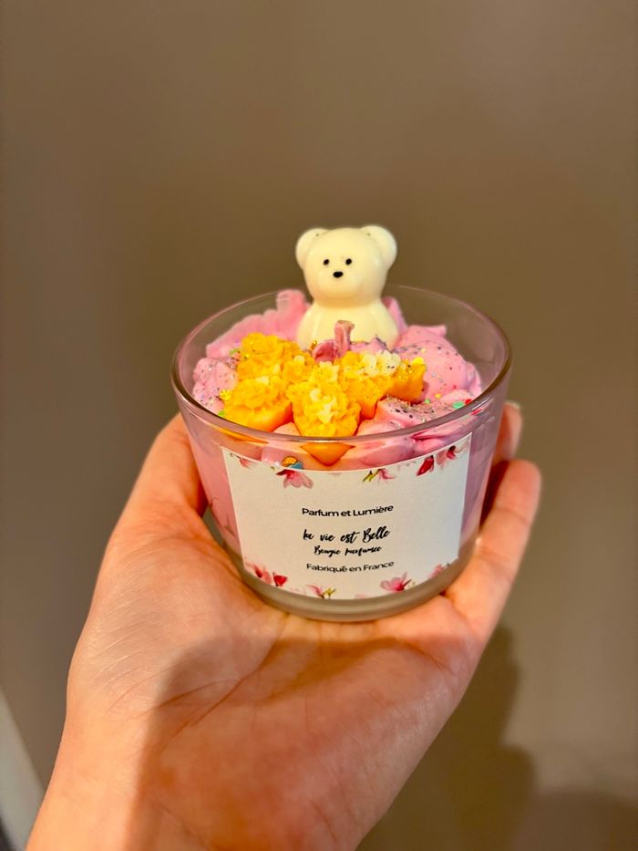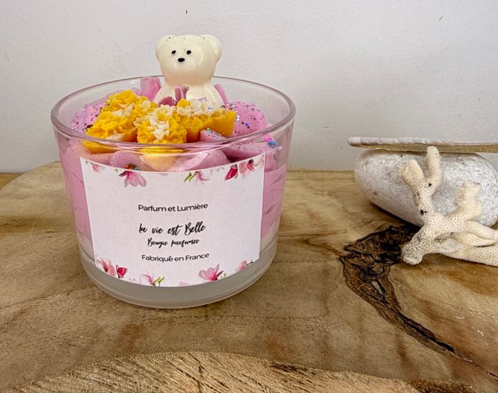Bougie parfumée inspiration La vie est belle poids: +/- 160 g de cire Cire végétale 100% naturelle, sans OGM, non testé sur les animaux, vegan. Le parfum est sans CMR, sans phatlate, non testé sur les animaux. Fabrication artisanale