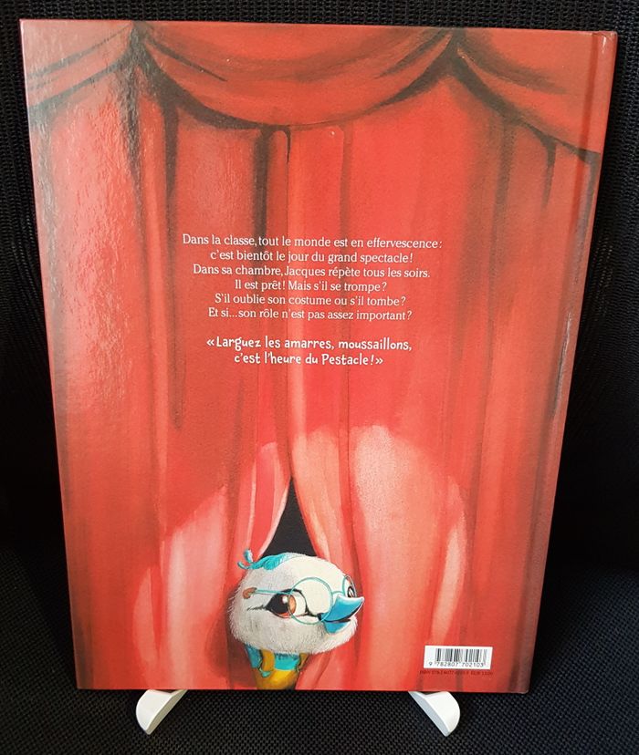 Dans la classe, tout le monde est en effervescence : c'est bientôt le jour du grand spectacle ! Dans sa chambre, Jacques répète tous les soirs. Il est prêt ! Mais s'il se trompe ? S'il oublie son costume ou s'il tombe ? Et si... son rôle n'est pas assez important ? « Larguez les amarres, moussaillons, c'est l'heure du Pestacle ! » Prix Neuf indicatif actuel : 13,00 E. Édition cartonnée Format 241x319 EAN 9782807702103 juin-24 Très Bon État, coiffe haute tassée, angles bas tassés, intérieur TBE, sans écritures. Une imposante liste de livres pour enfants disponible, essayez un premier contact ;-) Poids : 495 g