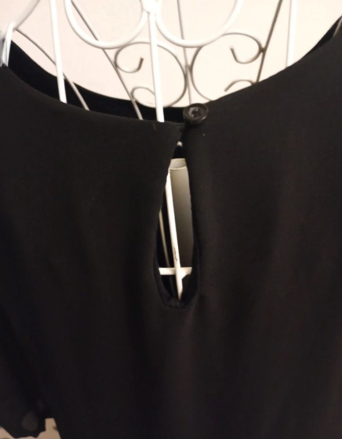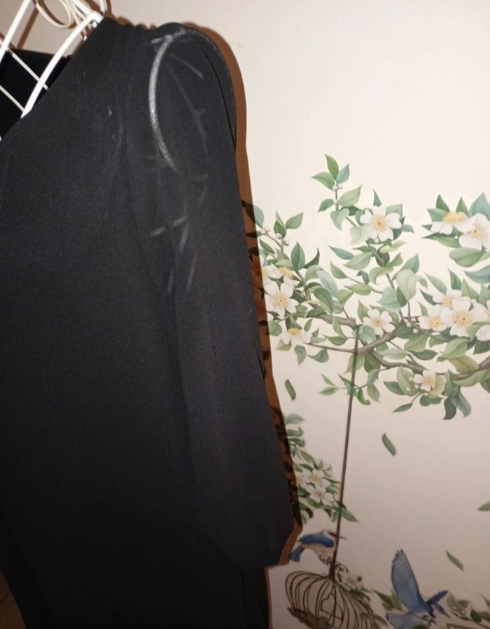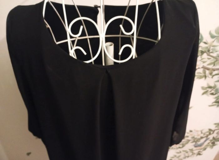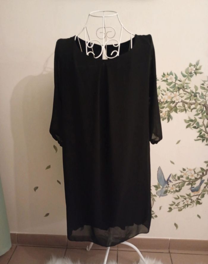 Robe ou tunique en voile entièrement doublée. Couleur noire. Taille unique mais va un L-Xl. S'attache avec un petit bouton. Manches 3-4 en voile ⚠️vendue SANS la ceinture