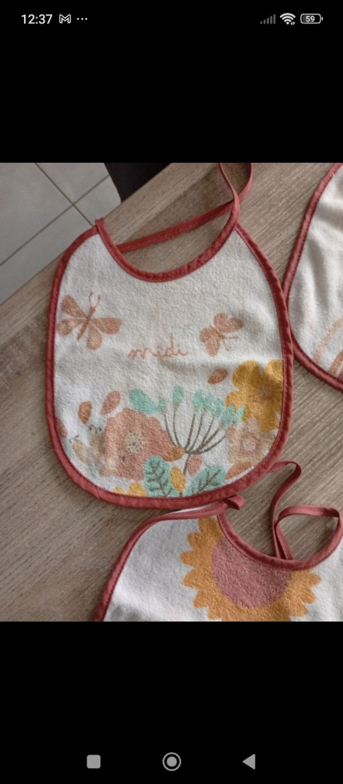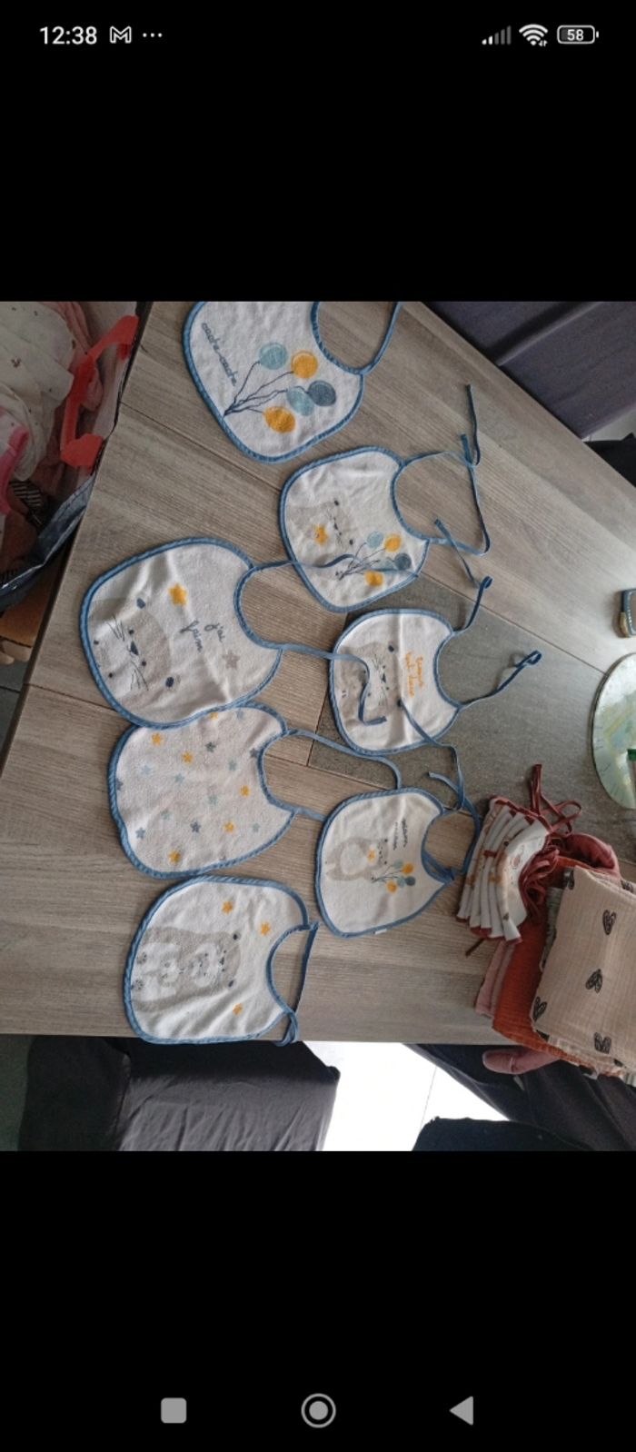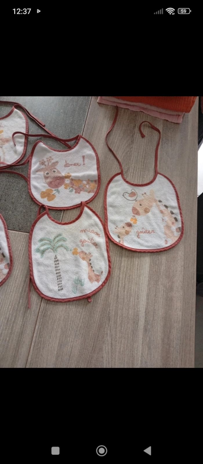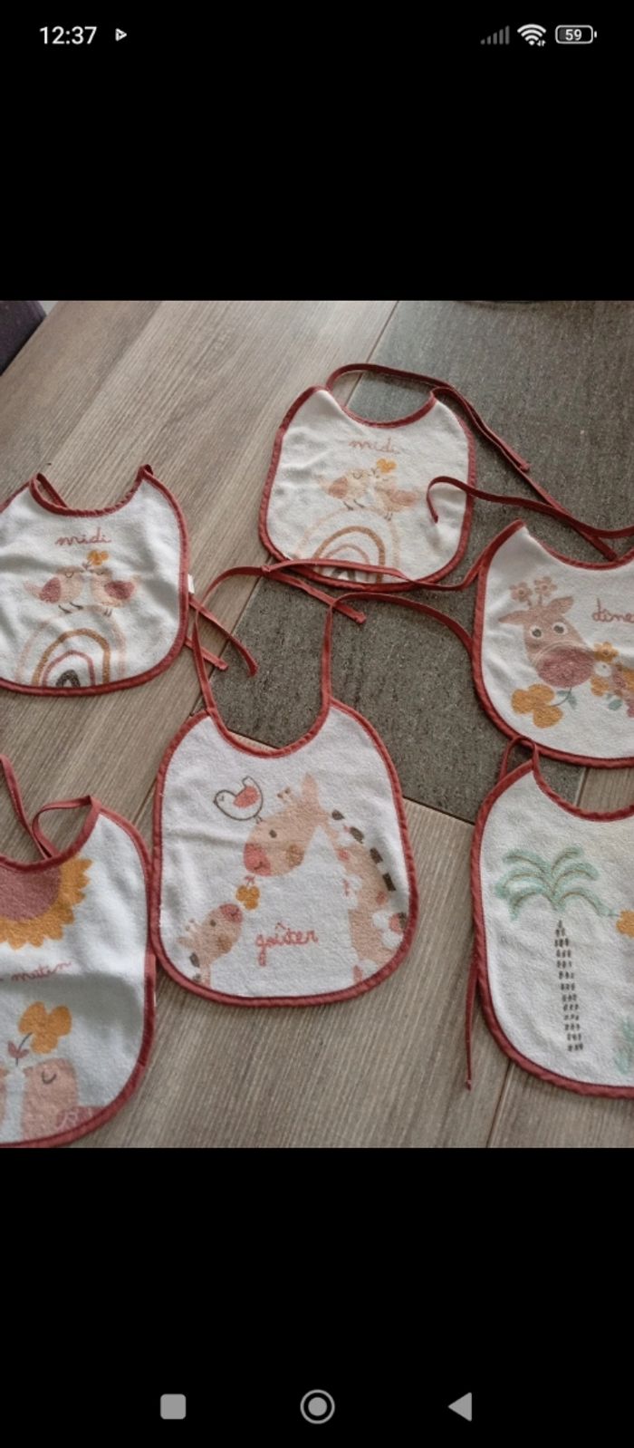 Lot de bavoir 8 bavoirs marron 8 bavoirs bleu Quelque petite tâche mais n'arrive pas à les avoirs en machine meme après plusieurs lavage mais sinon son en bonne état