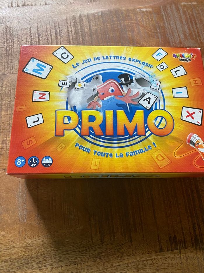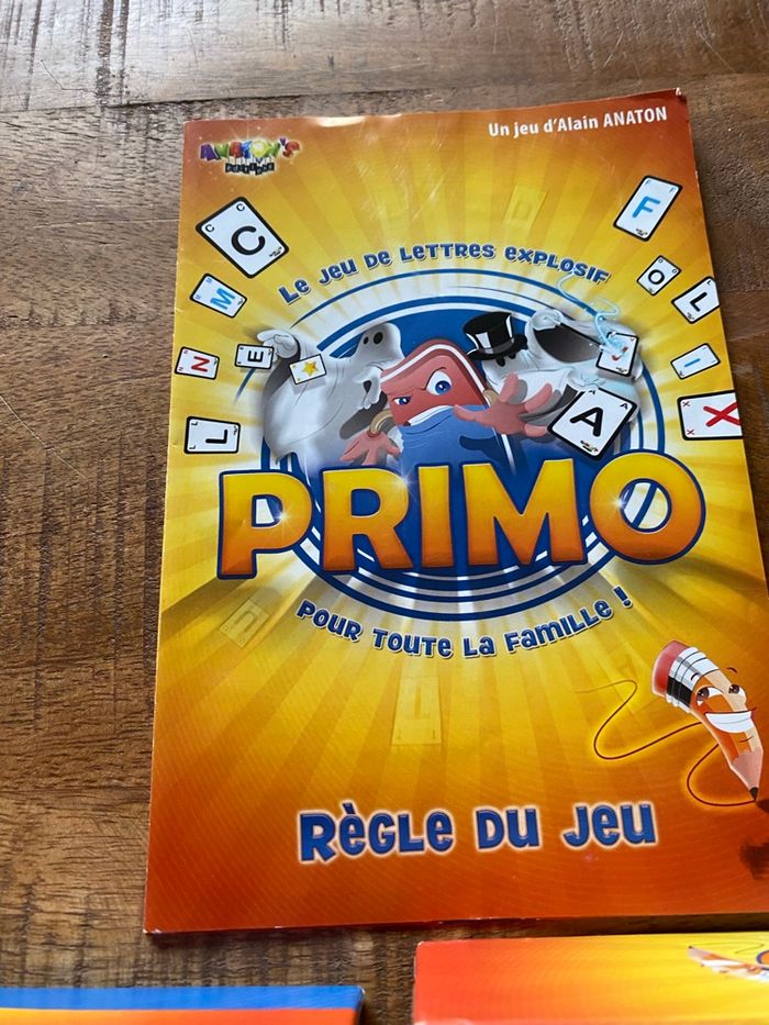 À vendre, jeu de société PRIMO de chez Anaton's Editions. Un jeu de lettres dynamique, addictif et "explosif" pour toute la famille ! Le but est simple : être le premier à composer 4 mots (de 3, 4, 5 et 6 lettres), mais attention aux cartes "Attaque" de vos adversaires qui viennent pimenter la partie. • État : Très bon état (voir photos). • Contenu : Complet (110 cartes, boîte de rangement et règle du jeu incluse). • Nombre de joueurs : 1 à 6 joueurs. • Âge : À partir de 8 ans.