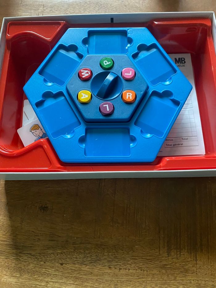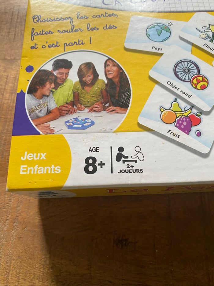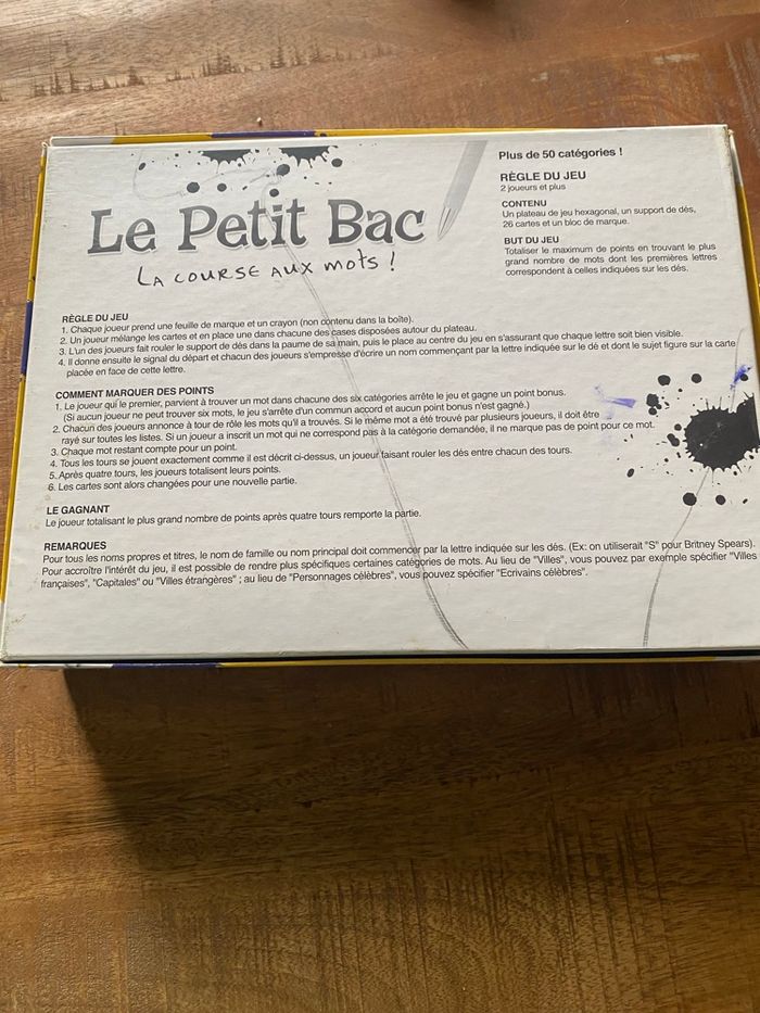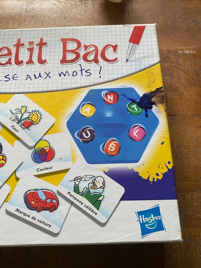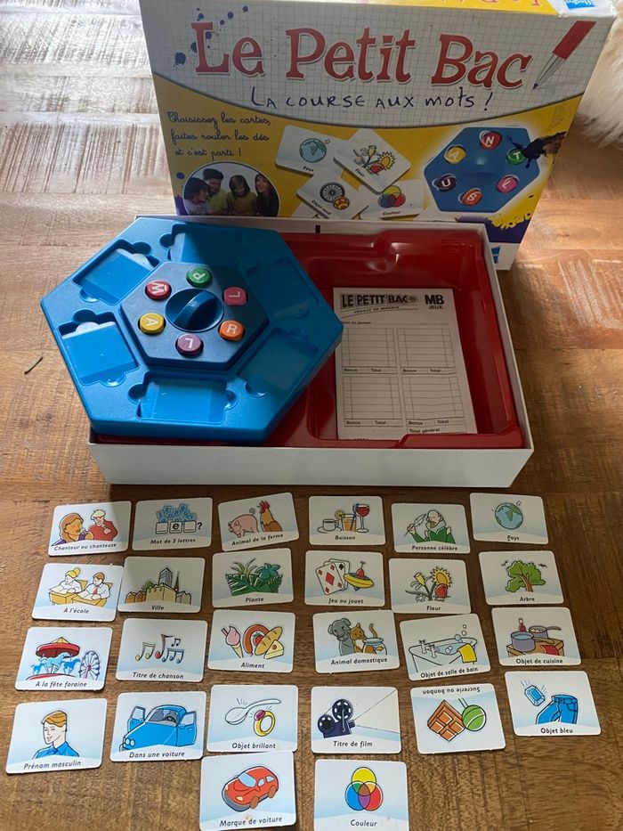 Vends jeu de société "Le Petit Bac - La course aux mots", édition MB / Hasbro de 2003. Un grand classique indémodable pour jouer en famille ou entre amis ! Le but est simple : trouver le plus de mots commençant par les lettres indiquées par les dés dans les catégories piochées (Pays, Animal, Objet bleu, Célébrité, etc.). Contenu du jeu : • 1 plateau de jeu hexagonal bleu. • Le support de dés central avec ses 6 dés colorés. • 26 cartes catégories (ex: "Marque de voiture", "Aliment", "Film"...). • Un bloc de feuilles de marque (déjà entamé mais reste de nombreuses feuilles). État : * Le mécanisme des dés fonctionne parfaitement. • Les cartes et le plateau sont en très bon état. • À noter : Une petite tache d'encre bleue est présente sur le couvercle de la boîte (voir photos), mais cela n'altère en rien l'utilisation du jeu. Idéal pour les enfants dès 8 ans (et les plus grands !). De 2 à 6 joueurs (ou plus en équipes).