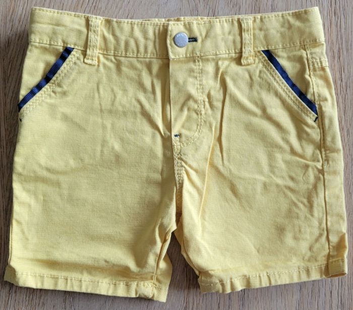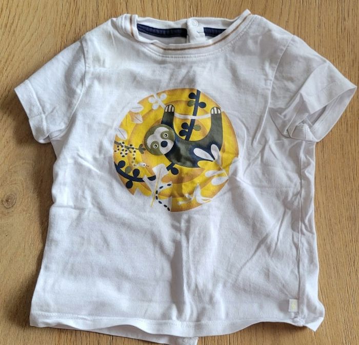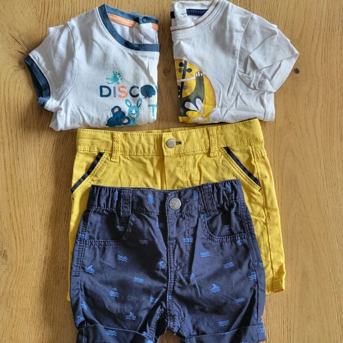 4 vêtements été, 6 mois, peu portés, en très bon état : - 2 tee shirt Obaibi, pressions dans le dos - 1 short jaune Obaibi, ajustable à la taille, bouton pression - 1 short bleu Grain de blé, taille elastiquée, bouton pression