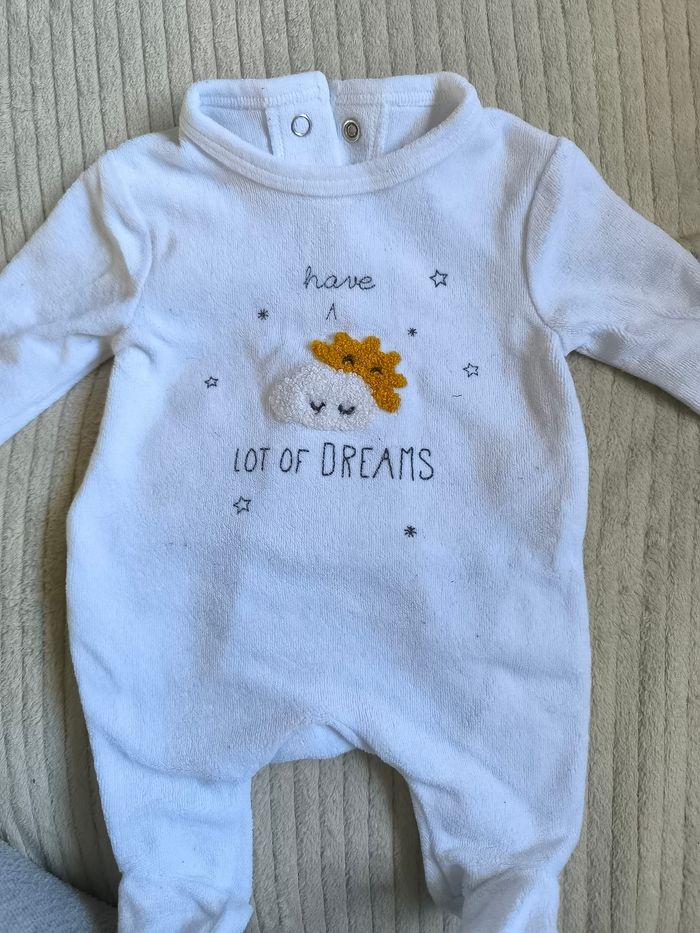 Vend pyjama velours, couleur blanc avec des motifs Taille 0 mois Très bon état et très peu porté
