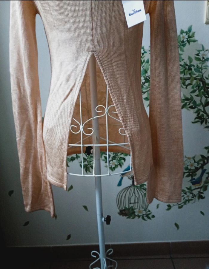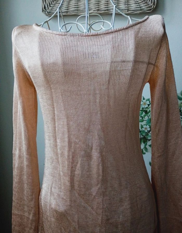 Très joli pull en maille . Fente à l'arrière. Couleur beige un peu brillant. Taille S. Neuf