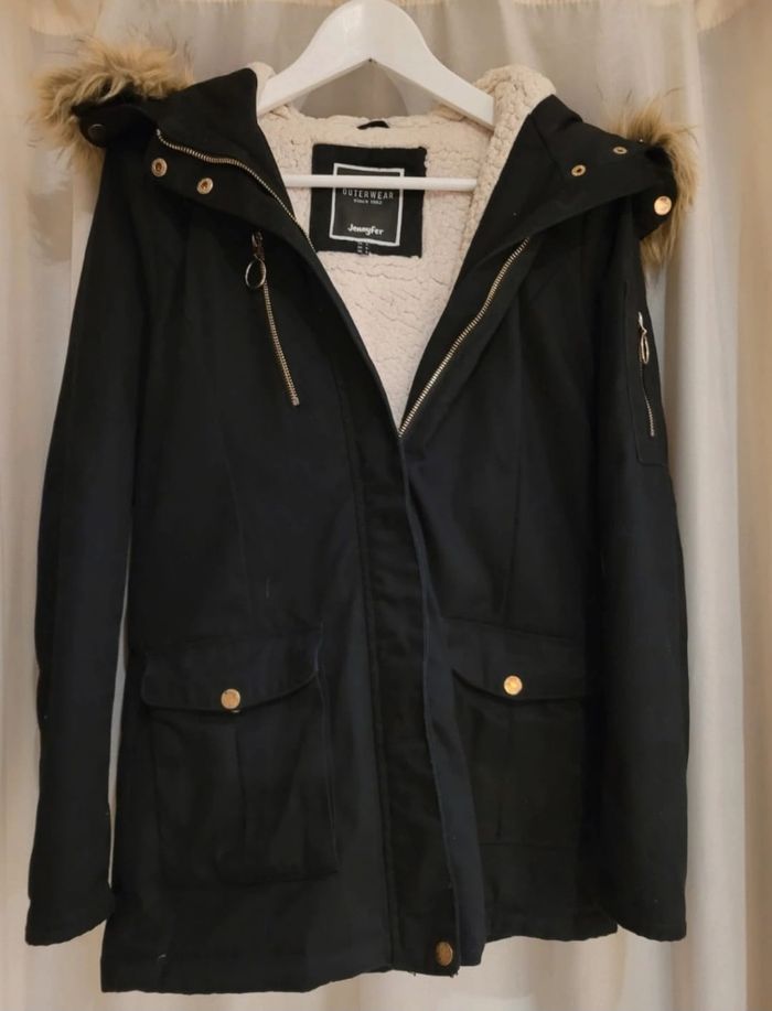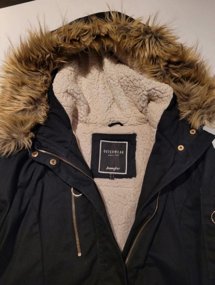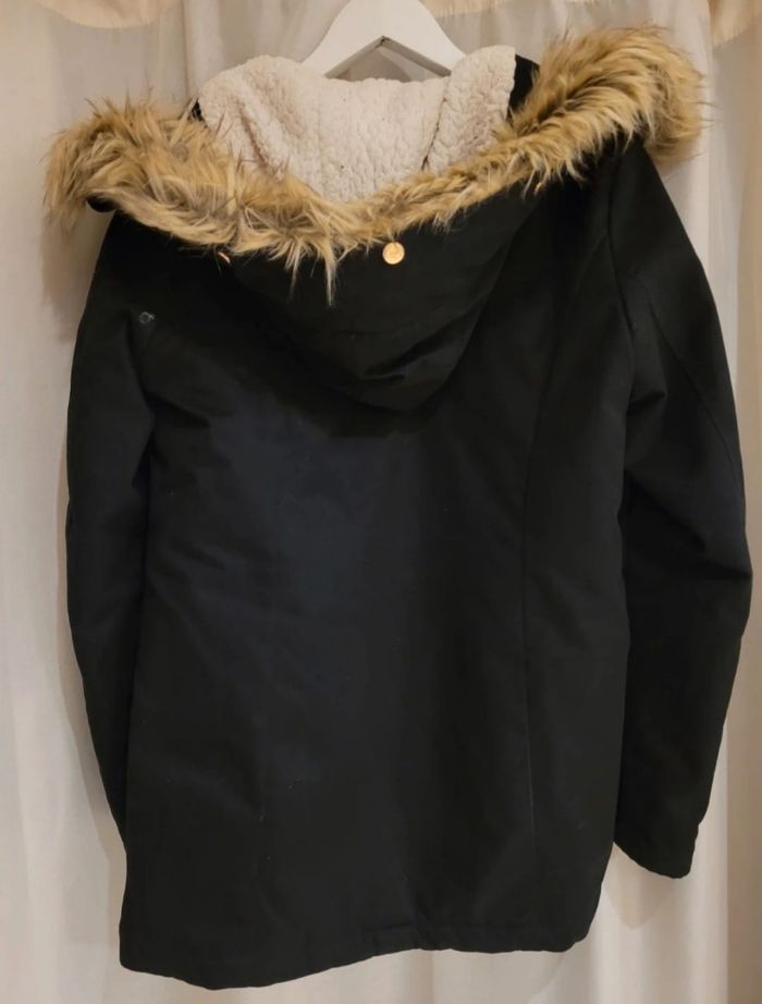 Manteau noir fourrure à l intérieur avec capuche fourrure qui se détache grâce aux boutons à pression en très bon état taille S