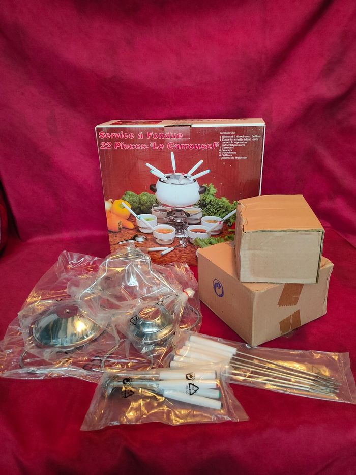 Vends service à fondue 22 pièces neuf jamais servi composé de : 1 réchaud à alcool avec brûleur, 1 caquelon émaillé blanc avec couvercle séparateur anti-éclaboussures, 1 carrousel, 6 sauciers, 6 fourchettes, 6 cuillères, 1 plateau de protection