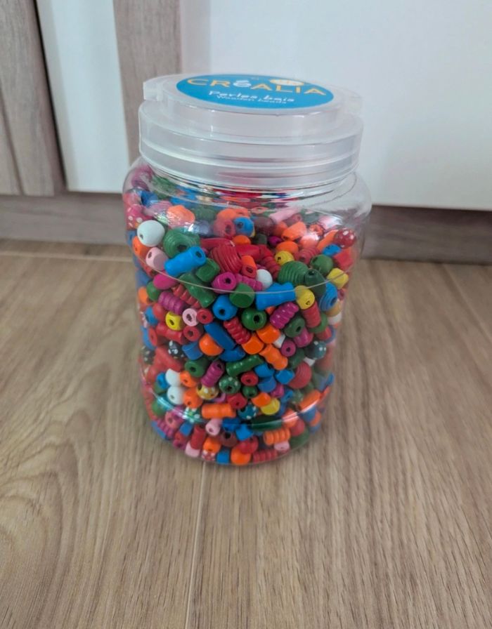 Pot avec différentes perles en bois multicolore