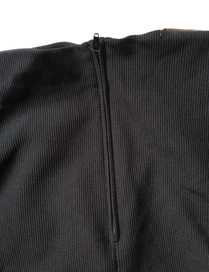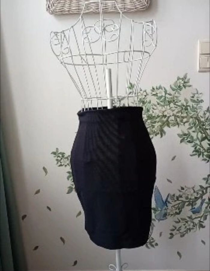 Jupe crayon côtelée noir, matière élastique. Se ferme avec fermeture éclair, taille XS. Il n'y a pas d'étiquette de taille mais taille XS.