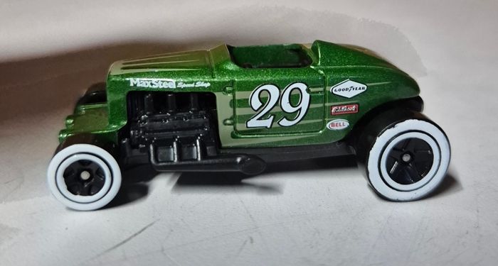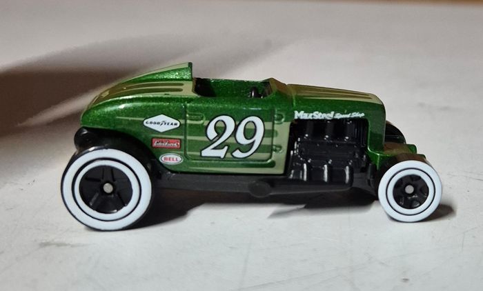 Modèle réduit Hot Wheels Max Steel™, hot rod vert métallisé décoré du numéro 29 et de logos racing (MaxSteel Speed Shop, Goodyear, Edelbrock, Bell). Carrosserie avec flammes blanches, moteur latéral apparent et roues noires à jantes blanches. Vitrages teintés et style inspiré des courses vintage. Châssis noir estampillé Max Steel™, fabrication Malaisie, ©2021 Mattel. Modèle en bon état général avec légères traces d’usage. #hotwheels #maxsteel #hotrod #voitureminiature #diecast #hotwheelscollector #modelereduit #racingcar #speedshop