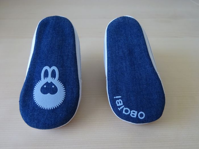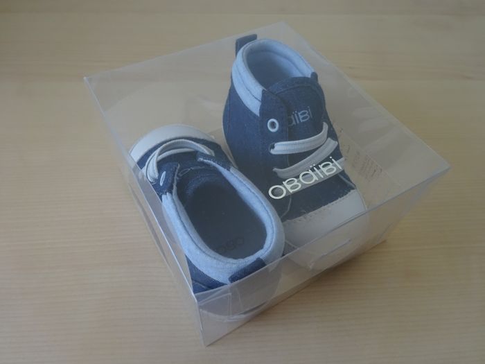 Baskets pour bébé 6-12 mois neufs dans leur boîte Obaïbi Longueur semelle 12 cm Coton 85% et polyuréthane 15% aspect jean Elastiques extensibles à l'avant pour faciliter la mise aux pieds Neufs jamais portés Possibilité vente au détail ou lot avec mes autres articles