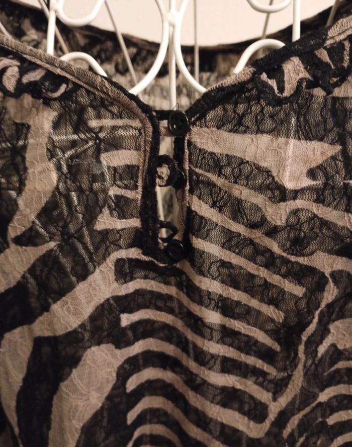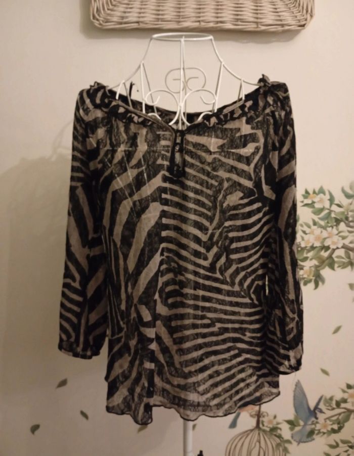Blouse légère (il faut mettre un débardeur en dessous. Couleur noir et marron beige. Taille 2 soit taille M. Manches 3/4
