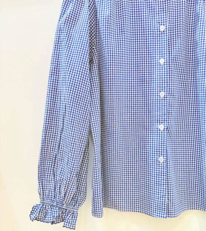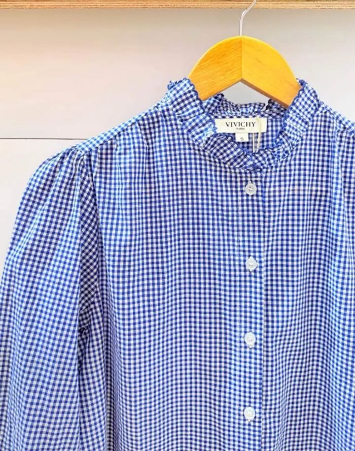 Magnifique chemise à petits carreaux bleu , col rond , entièrement boutonnée , manches longues Taille 50 Largueur sous aisselles 68 cms