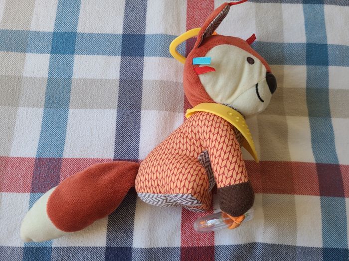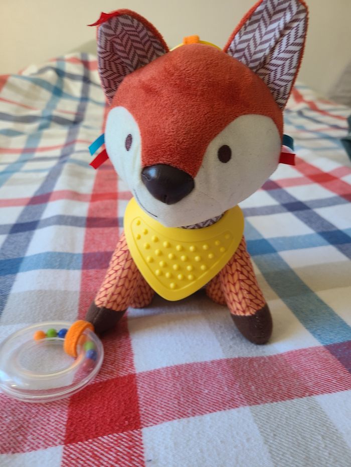 Renard en peluche avec hochet et jouet de dentition bandana amovible à surface texturée et plein de textures, de motifs et de sons. Collection Bandana buddies Skip hop. Très bon état général.