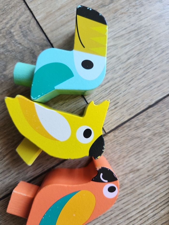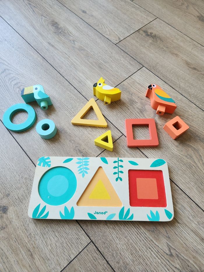 Jeu d'apprentissage des formes, des tailles et des couleurs. De la marque Janod. Il y a quelques petits endroits où la peinture est partie (voir photo). Vendu sans la boîte d'origine.