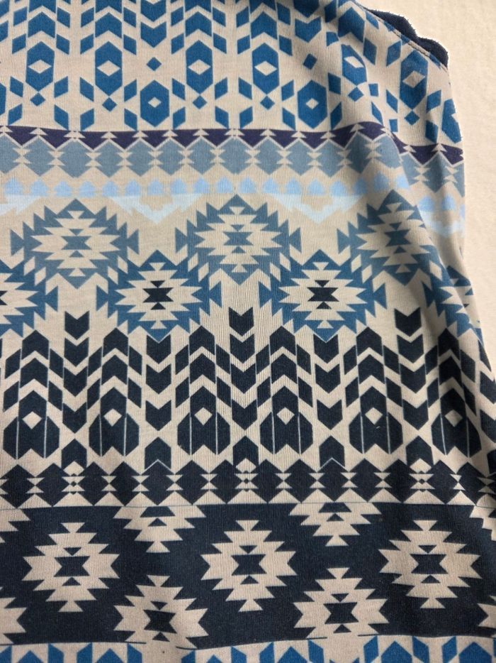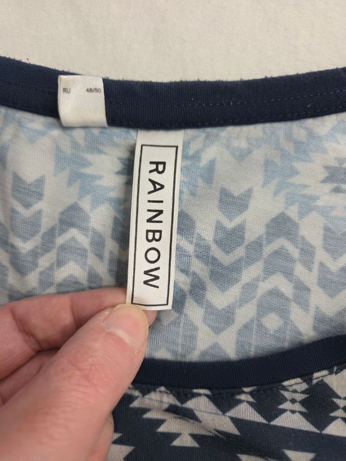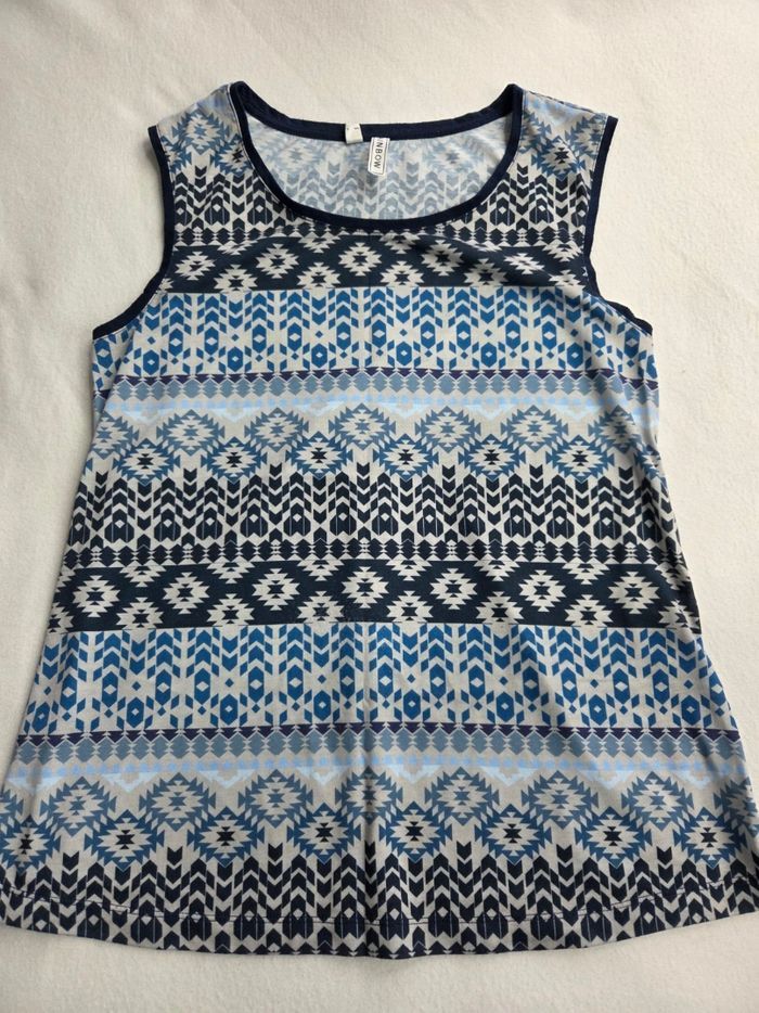 Debardeur RAINBOW imprimé géométrique bleu et blanc. Coupe droite légèrement évasée, confortable et facile à porter. ✔ Taille : 40/42 (M) ✔ État : très bon état