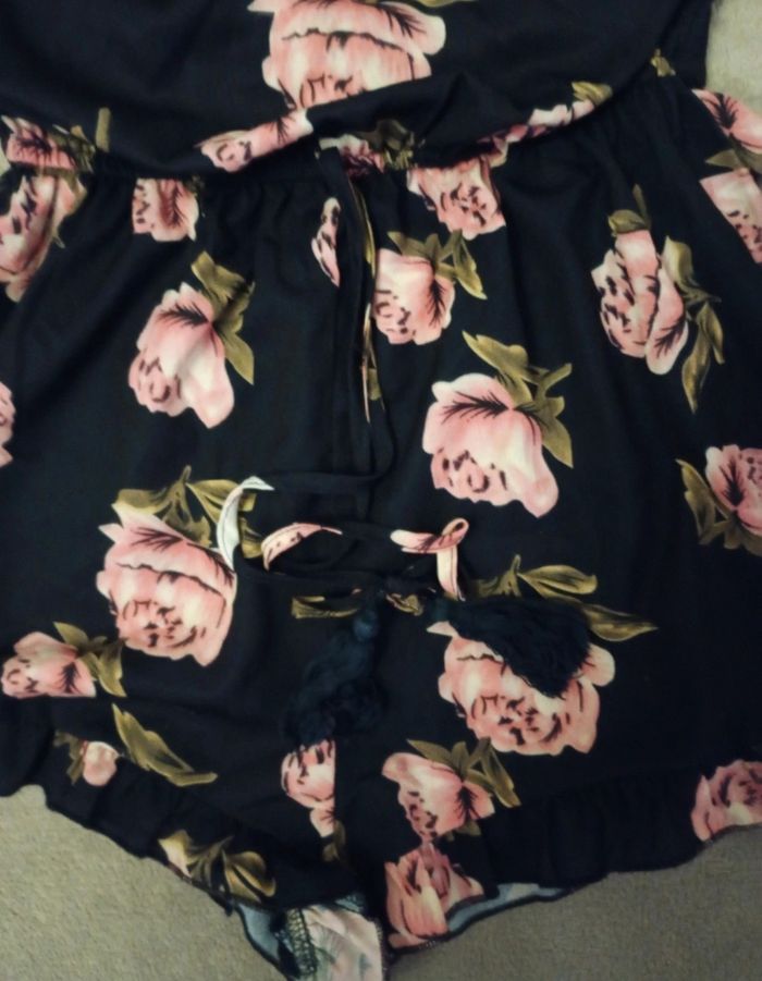 Combi short fleurie bleu foncée, fluide. Taille S mais taille petit. Plus pour un XS. Avec petit ceinture ponpons.