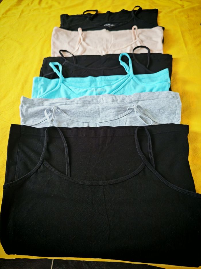 Lot de 6 maillots à bretelles femme taille L le maillot bleu ciel et de taille M mais il est aussi grand que le L. Les maillots sont en bon état