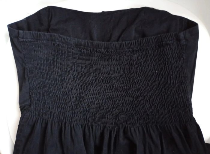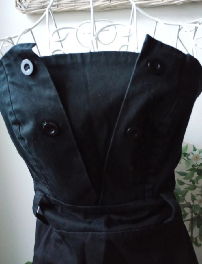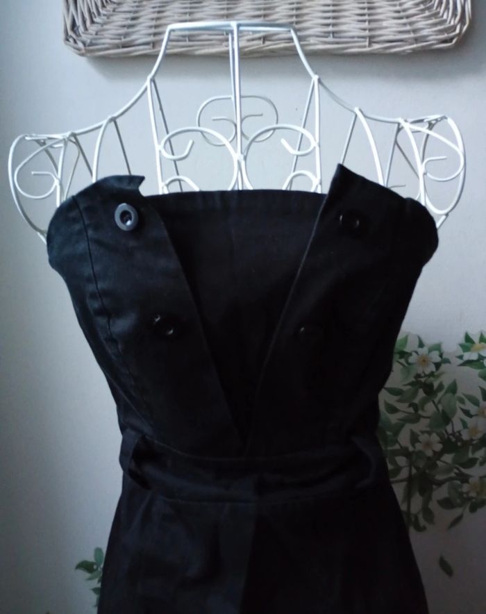 Robe bustier (vous pouvez ajouter des petites bretelles vous -même si vous préférez 😊)Couleur noir, élastique au dos. Désolée elle n'est pas repassée mais le sera si achat. Taille 40 mais taille petit. Plutôt pour une taille S-M.