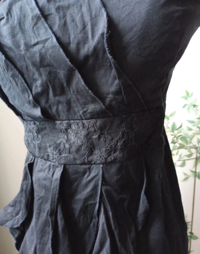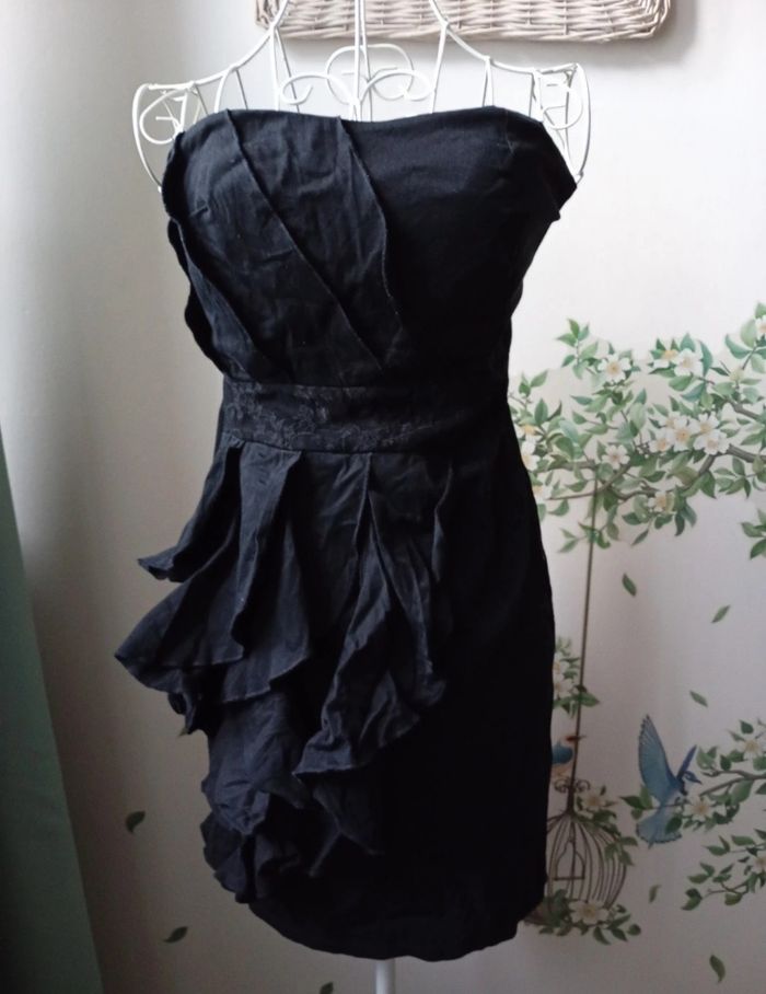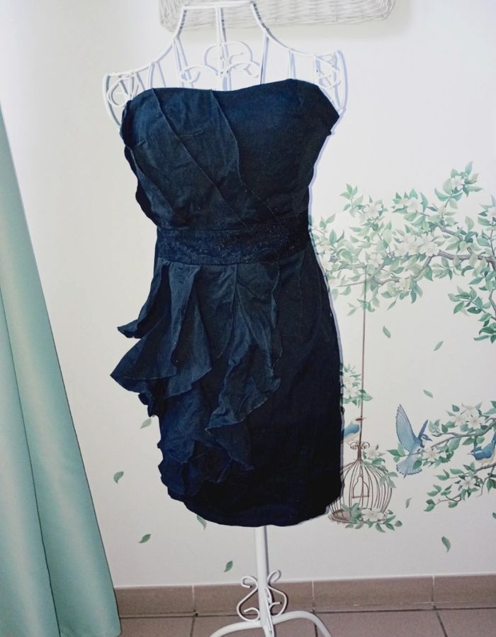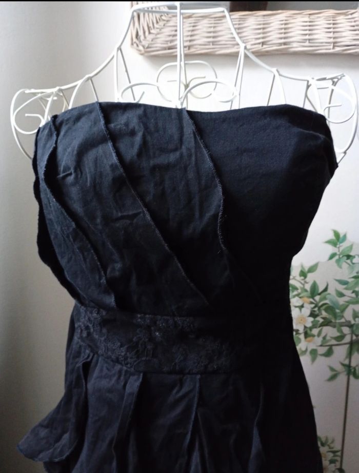Robe bustier (vous pouvez ajouter des petites bretelles vous -même si vous préférez ☺️)Couleur noir, élastique au dos. Désolée elle n'est pas repassée mais le sera si achat. Taille 42 mais taille petit. Plutôt pour une taille S-M.