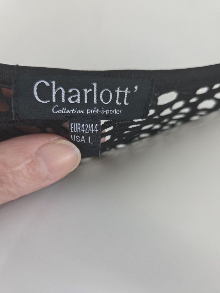 Haut noir ajouré style dentelle 🖤 ✔ Marque : Charlott’ (collection prêt-à-porter) ✔ Taille : EUR 42/44 – USA L ✔ Col V ✔ Manches courtes ✔ Matière ajourée / effet résille élégante ✔ Base satinée À porter avec un débardeur noir ou nude en dessous. Parfait pour l’été, les soirées ou par-dessus un maillot à la plage 🌊 ✨ État : très bon état