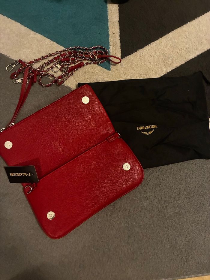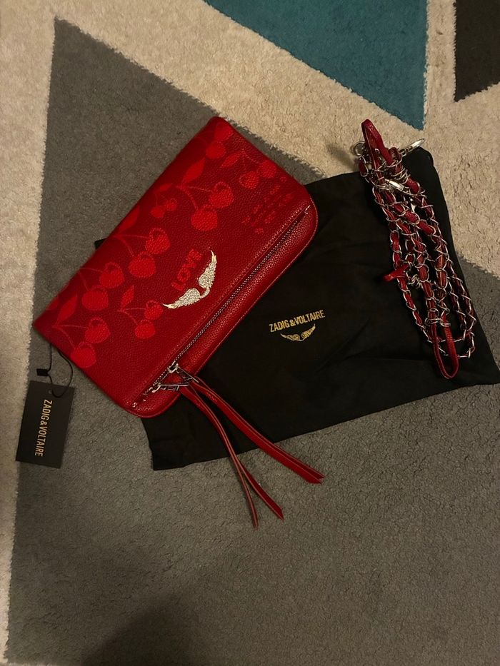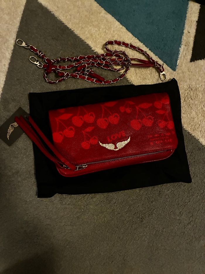 ✨ État : neuf, jamais porté (étiquette encore attachée) 📌 Marque : Zadig & Voltaire 👜 Modèle : Rock Clutch Cherry Print 🎨 Coloris : rouge avec imprimé cerises ton sur ton 🕊️ Ailes iconiques métalliques à l’avant 🔗 Bandoulière chaîne argentée et cuir rouge incluse 🧥 Fermeture zippée 💎 Modèle iconique revisité avec motif cerises, super original et tendance. Format pratique pour téléphone, portefeuille, clés… Peut se porter à l’épaule ou en crossbody. 📦 Vendu avec housse de protection d’origine.