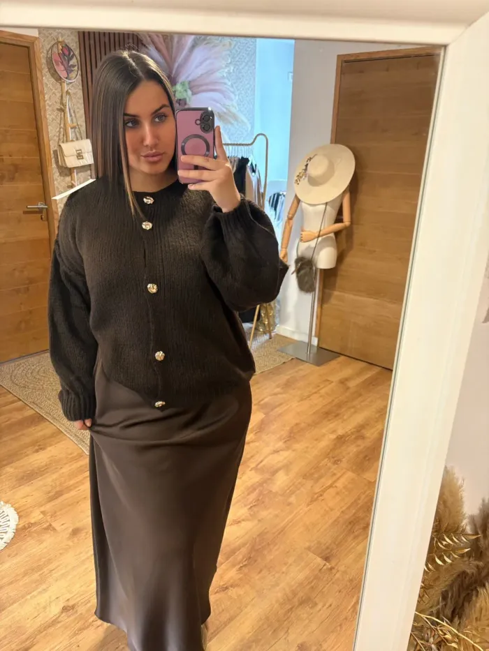 La jupe est longue et fluide, avec une coupe évasée qui tombe jusqu’aux chevilles. Elle est réalisée dans une matière lisse et satinée, ce qui lui donne un bel effet brillant et élégant. Taille haute, elle marque bien la taille et allonge la silhouette Style chic et moderne, facile à porter aussi bien pour une occasion habillée que pour un look élégant du quotidien Elle apporte beaucoup de mouvement et un rendu très raffiné 🌸 TU XL au XXXL Composition : Polyester (100%) Collection : Hiver/ Printemps 2025/2026 Made in France