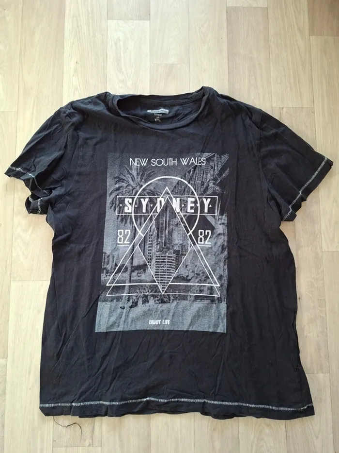 T-shirt In Extenso noir, coupe fitted, taille XXL. Imprimé graphique Sydney / New South Wales sur le devant. ✔️ Manches courtes ✔️ Coupe ajustée ✔️ Coton confortable ✔️ Style urbain / casual 📌 État : bon état, traces d’usure légères liées à l’usage (voir photos), pas de trou ni tache majeure. Idéal pour un look décontracté, porté seul ou sous une veste. 📦 Envoi rapide et soigné 💬 N’hésite pas à me contacter pour toute question
