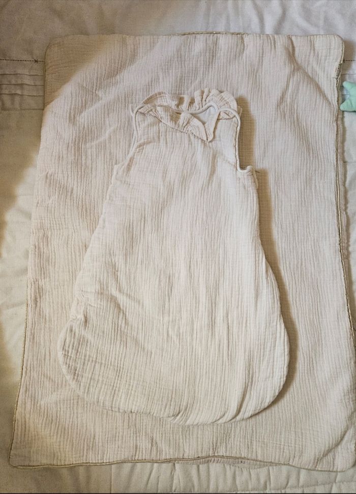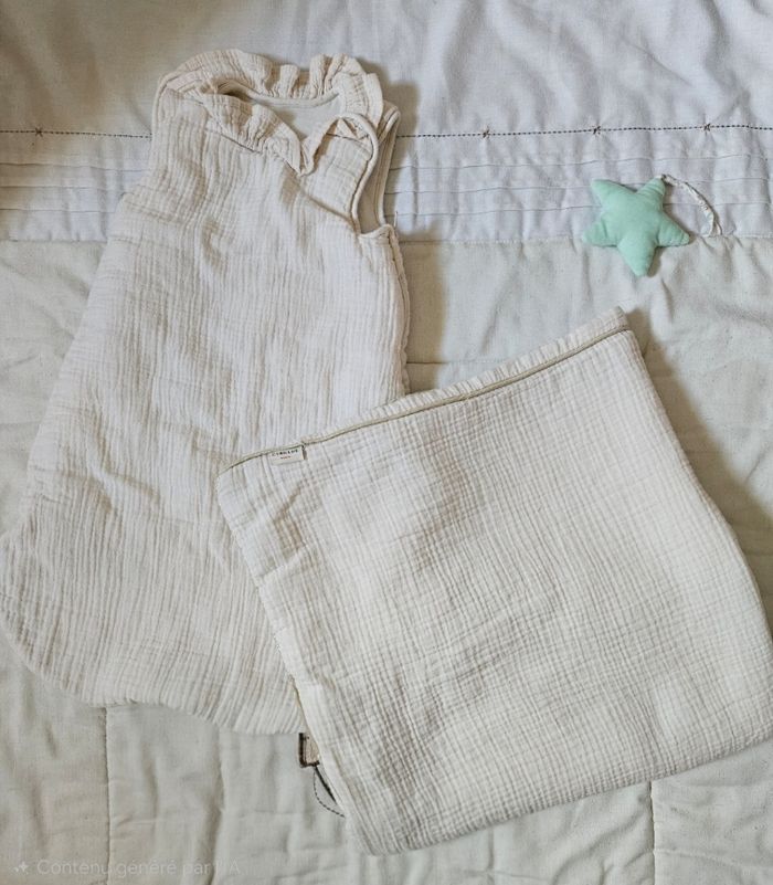 Ensemble gigoteuse et couverture. Taille : 0/6 mois Marque : Cyrillus Paris Matière : Gaze de coton Très bon état Collection 2025. Acheté 49,90€ la gigoteuse et 37,90€ la couverture.